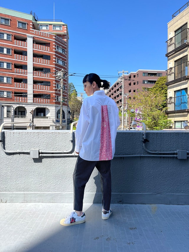 KAKERAシャツ ケサランパサランがゆらゆらと 麻の葉に舞い落ちたような なんとも情緒がありメルヘンな紋様である 絞り風で紋様自体は古典的だが 垢抜けた桃色故に 着物着物しておらず 寧ろ可愛らしさとポップな印象 桃色は華やかさや可愛らしさを増幅される作用がある 絞り風の白抜きちシャツの純白が打ち解けあって はなからそこに存在していたかのような相性抜群の掛け合わせ 素材感が パリッとした綿100%シャツと相性が良く はなからそこにいたようにシレッと馴染んでいる 元々の完成品にハサミを入れるのに 躊躇はあるが よりステキングにフュージョンしてもらうためにも そこは潔くいく 以前は、ハサミを入れずパッチワークしていたのだが ヨークがあるボディに限っては 挿げ替えてやるほうがごわつかずスッキリする故 その一手間を加えて作り上げる エレガントさより 小粋できっぷのいい作品 仕様は女性用であるが ビックシルエットで 袖が長く、襟周りもゆったりしている故 ユニセックスに男性にもお召しいただきたい ※※※※※※お手入れ※※※※※ ドライクリーニング推奨ですが ご自宅でのお手入れも可能です 単独でのお手入れをお願いします ▲■▲size▲■▲ モデルサイズ 166cm 50kg 本体:綿 100% パッチワーク: 絹 [絹製品の素材について Caution silk products] [ご購入をご検討のお客様へ] SAICOの製品は、アンティーク・ヴィンテージ それに類する着物帯地を リユースしたall hand made 製品 です 細心の注意を払って一点一点製作をしてい ますが 稀に解いた糸穴や経年変化による小さな汚れ等が ある場合があります また年代物のリユース品のため刺繍等のほつれもある場合もございます 時代を駆け抜けてきた 経年変化の一つの風合いとしてご理解 頂きその風合いをお楽しみください リユース品のため汚れほつれ等気になる方は ご購入をお控えくださいますようお願い申し上げます ご家庭での水洗等は風合の変化、縮み、色落ちの原因になりますので必ず避けてください ・絹製品は耐光堅牢度が弱いため直射日光や蛍光灯等の長時間照射により色あせることが ありますご注意ください 雨や汗など水に濡れることにより輪ジミ色落ち、色移りすることがあります ・絹は非常にデリケートな素材ですので極度な負荷が加わることで縫い目が開いたり 目寄れ ( 縦糸が滑り目が開く ) 性質を持って いますことご了承ください 着用時にベルトやバックなどの引っ掛かりや 摩擦にご注意ください、万が一刺繍がほつれた時は引っ張らずに、そのままご使用になるか、気になる方はハサミなどでカットしてください hand made /made in Japan