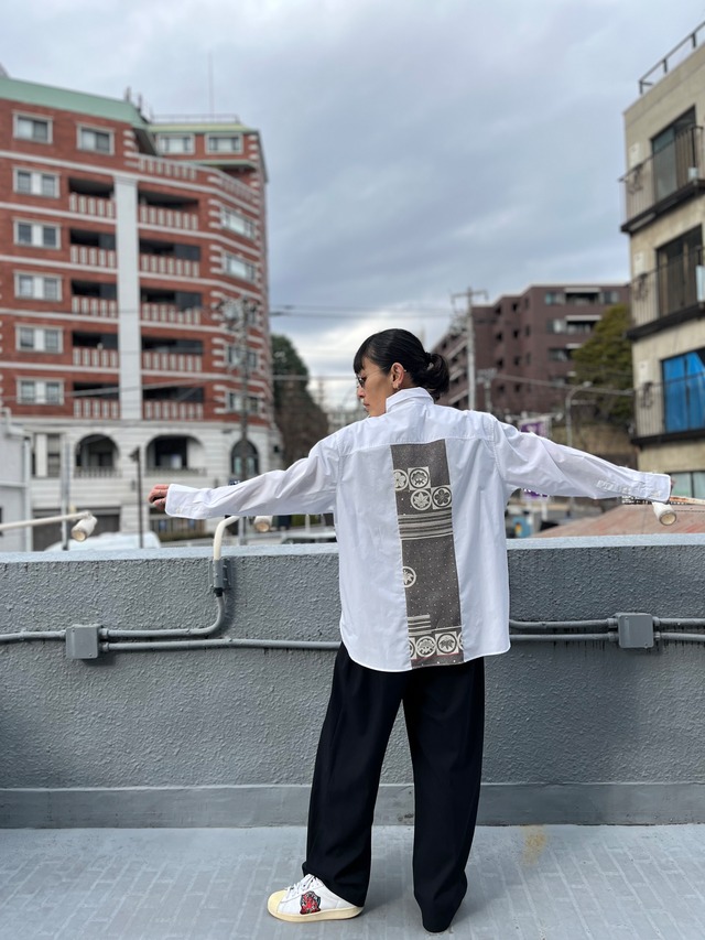家紋を背負いこむ 背紋はご先祖様を表し災厄から守ってくれるとされている 背守りとも言う そんな家紋を背にたなびかせたシャツ 純白の心地よい綿シャツに 潔く鋏を入れて空洞を作る 分断され裂け目のできた地面を繋ぎ合わせるように着物ハギレ当てはめて 新たな息吹を与えたシャツ 家紋は日本の文化の中でも 最も美しい美術だと己は思っており 常日頃から作品に登場するアイテム 女性らしさとエレガントさより 男前なきっぷの良さが先立つ 家紋が通常目にするものより 一回り大きいのにお気づきだろうか そう 男物の家紋なのだ 七五三の羽織を再生故の家紋サイズ 綿100%のシンプルでオーソドックスなワイシャツは主役であり 引き立て役の脇役でもある またその逆も然り ※※※※※※お手入れ※※※※※ 家紋の白抜きが色褪せをしますので ご自宅洗い、水洗いクリーニングはせず ドライクリーニングをお願いします ▲■▲size▲■▲ モデルサイズ 166cm 50kg 本体:綿 100% パッチワーク: 絹その他混率不明 [絹製品の素材について Caution silk products] [ご購入をご検討のお客様へ] SAICOの製品は、アンティーク・ヴィンテージ それに類する着物帯地を リユースしたall hand made 製品 です 細心の注意を払って一点一点製作をしてい ますが 稀に解いた糸穴や経年変化による小さな汚れ等が ある場合があります また年代物のリユース品のため刺繍等のほつれもある場合もございます 時代を駆け抜けてきた 経年変化の一つの風合いとしてご理解 頂きその風合いをお楽しみください リユース品のため汚れほつれ等気になる方は ご購入をお控えくださいますようお願い申し上げます ご家庭での水洗等は風合の変化、縮み、色落ちの原因になりますので必ず避けてください ・絹製品は耐光堅牢度が弱いため直射日光や蛍光灯等の長時間照射により色あせることが ありますご注意ください 雨や汗など水に濡れることにより輪ジミ色落ち、色移りすることがあります ・絹は非常にデリケートな素材ですので極度な負荷が加わることで縫い目が開いたり 目寄れ ( 縦糸が滑り目が開く ) 性質を持って いますことご了承ください 着用時にベルトやバックなどの引っ掛かりや 摩擦にご注意ください、万が一刺繍がほつれた時は引っ張らずに、そのままご使用になるか、気になる方はハサミなどでカットしてください hand made /made in Japan