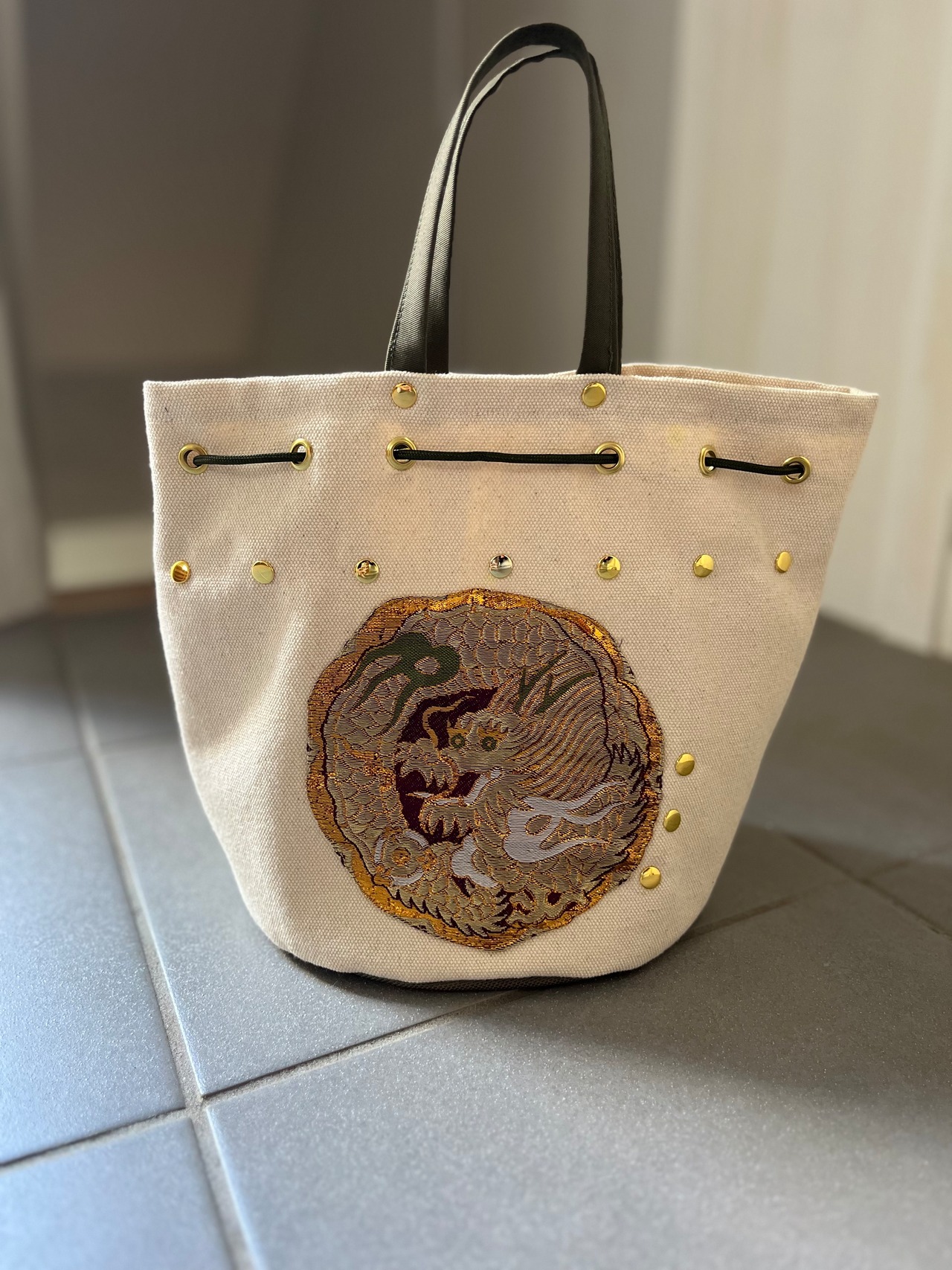 帆布に錦帯の龍神と寿の古代文字の帯をパッチワークし