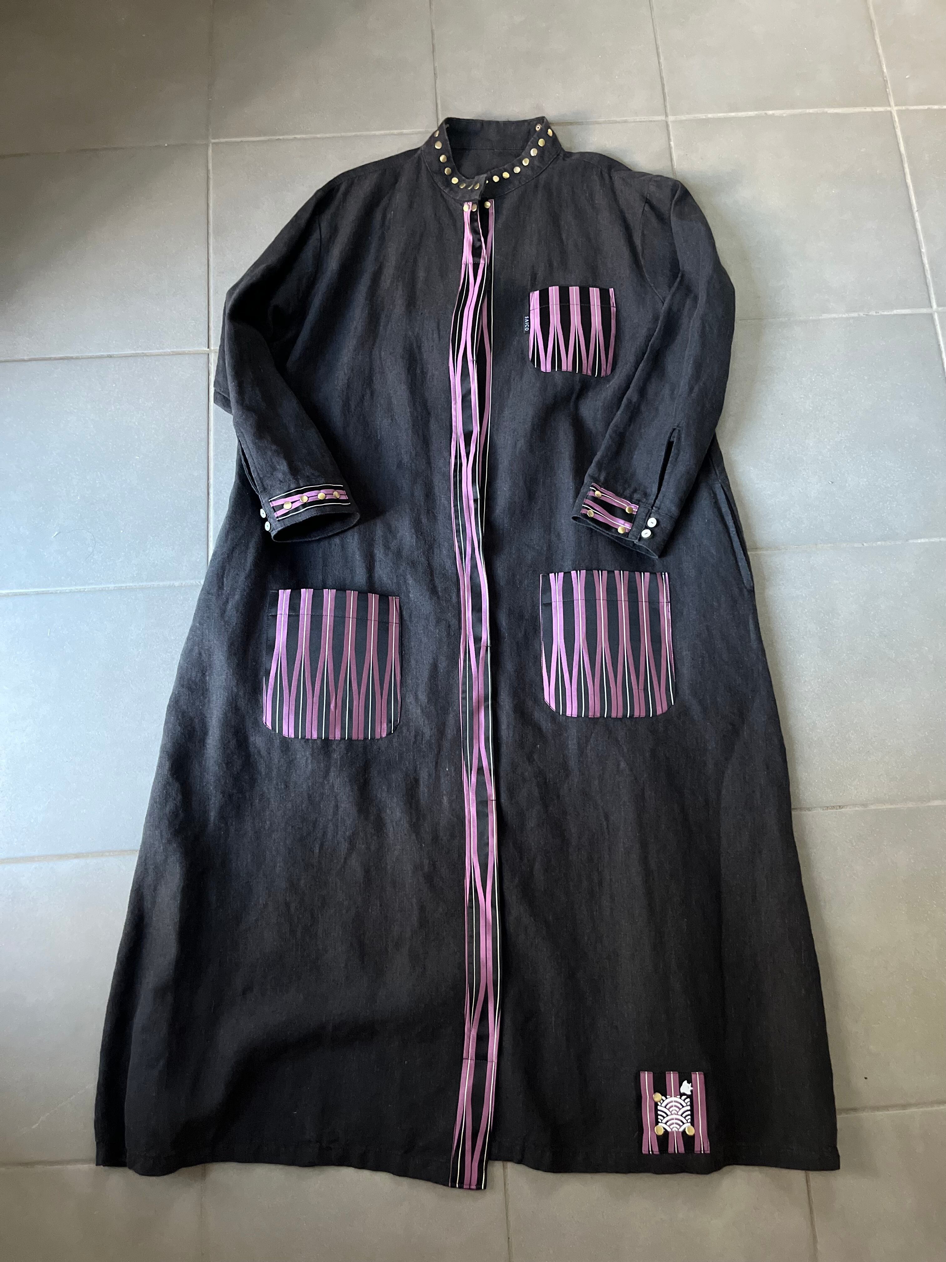 三枚目のためのローブ 着物ハギレパッチワークコート (パンツは別売)着物リメイク 麻コートワンピ 紬パッチワーク