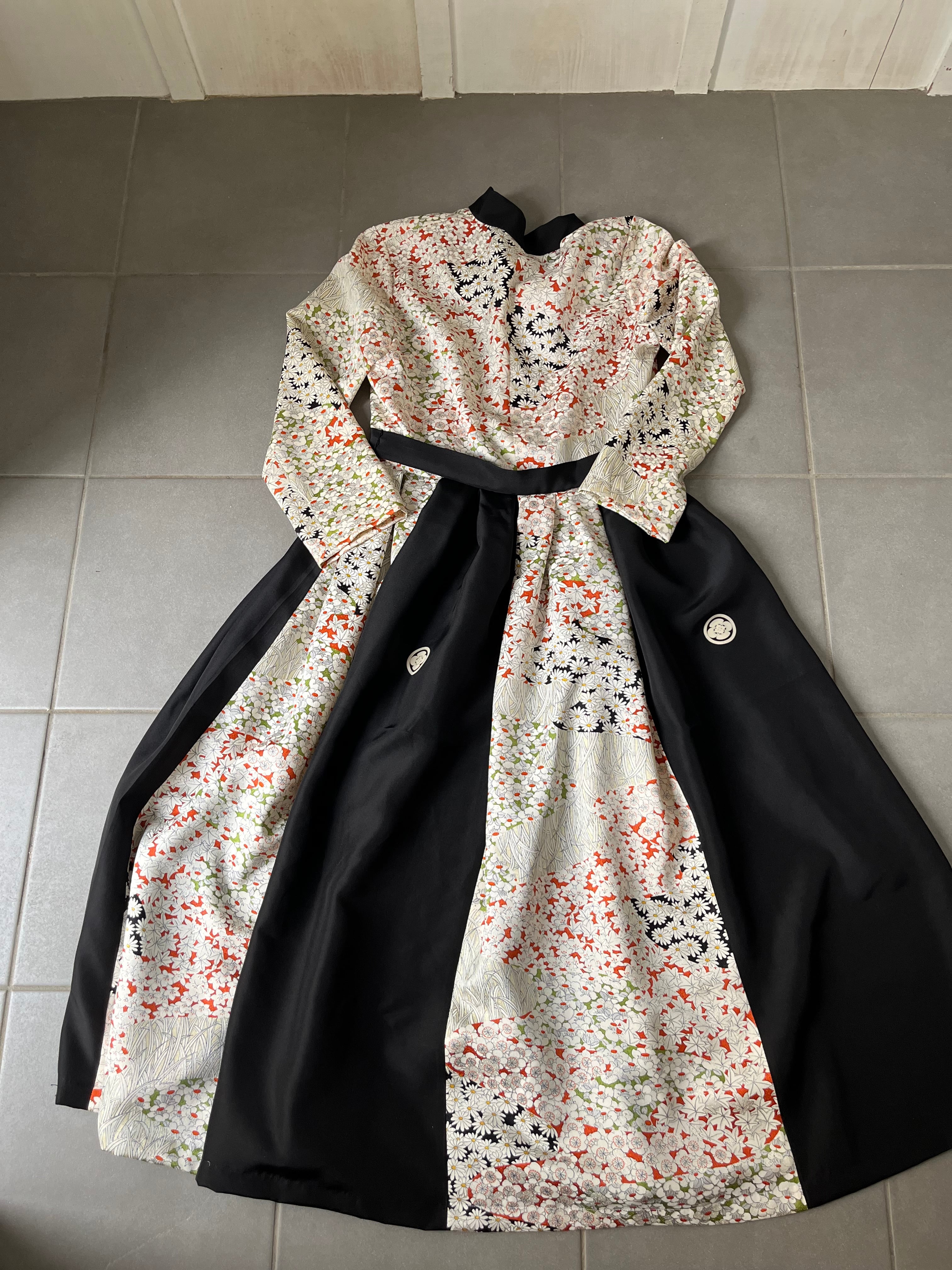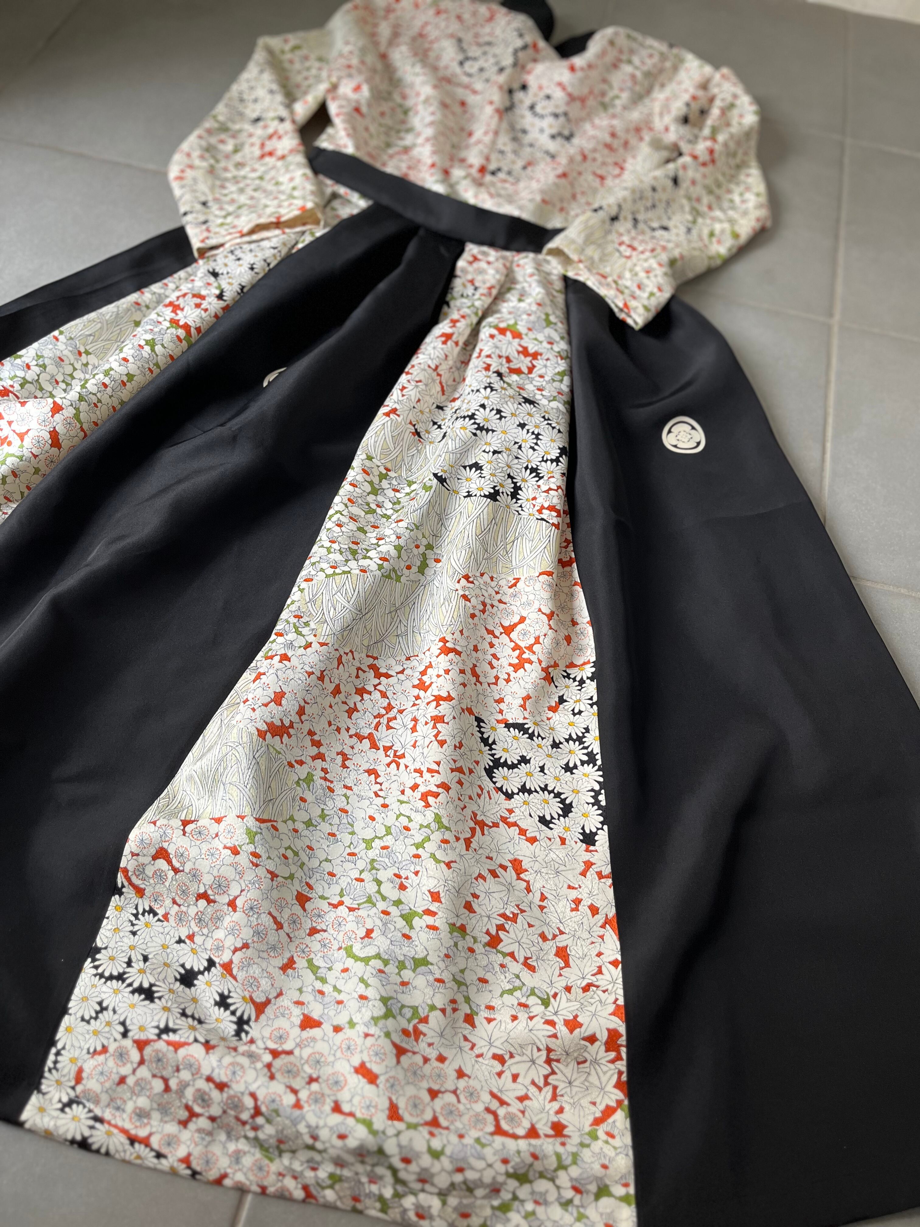四季色鮮やかな草花を描いた小紋と羽織の黒が溶け合った