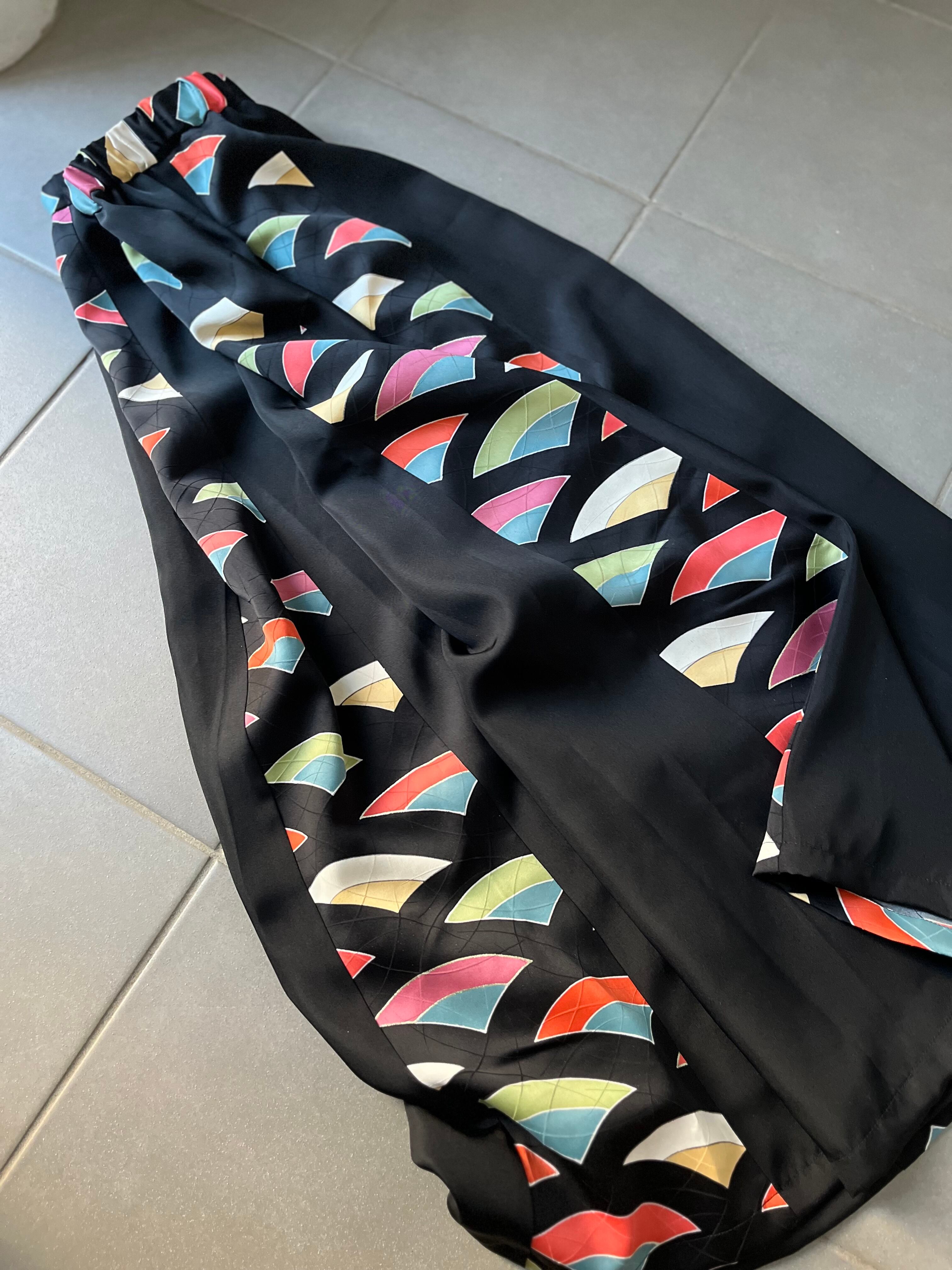 黒無地を主体としその狭間に美しく艶やかな彩色豊かな小紋のコントラスト美しく