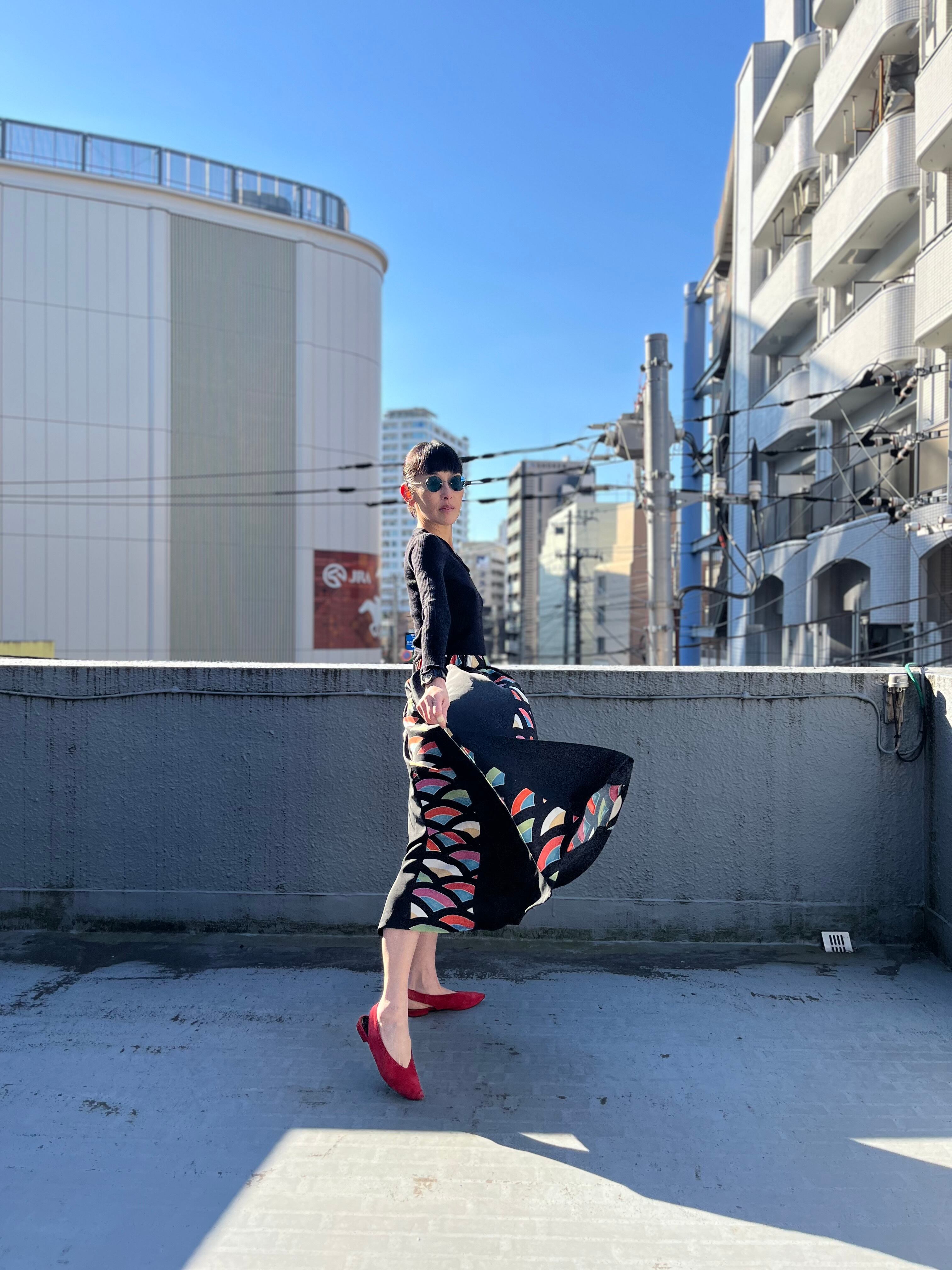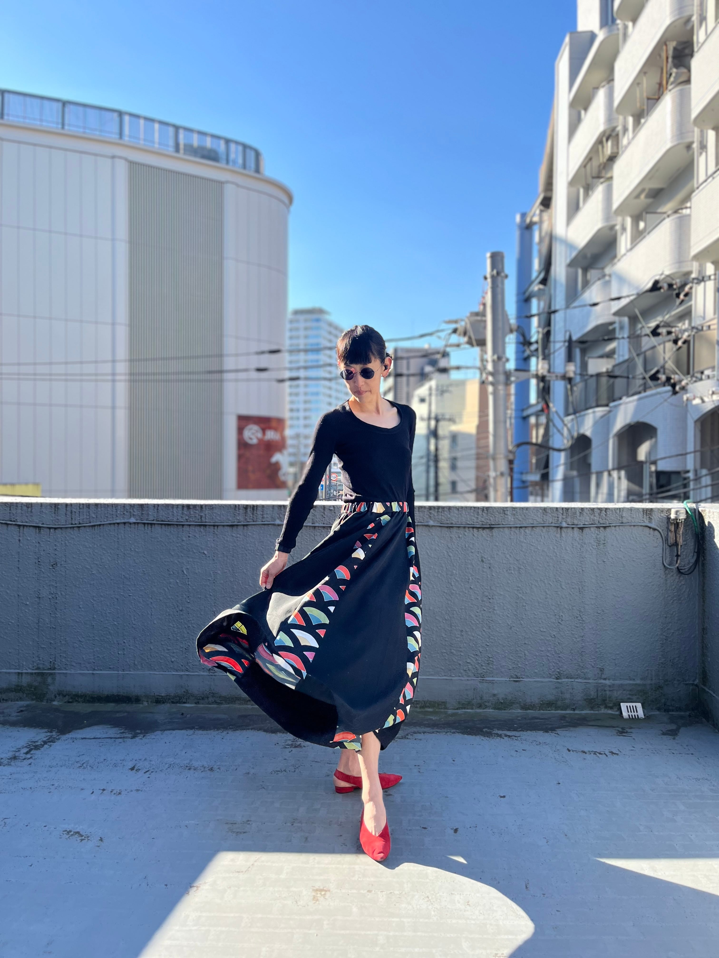 緩やかに弧を描く裾が歩くたびに軽やかで美しいシルエットだ
