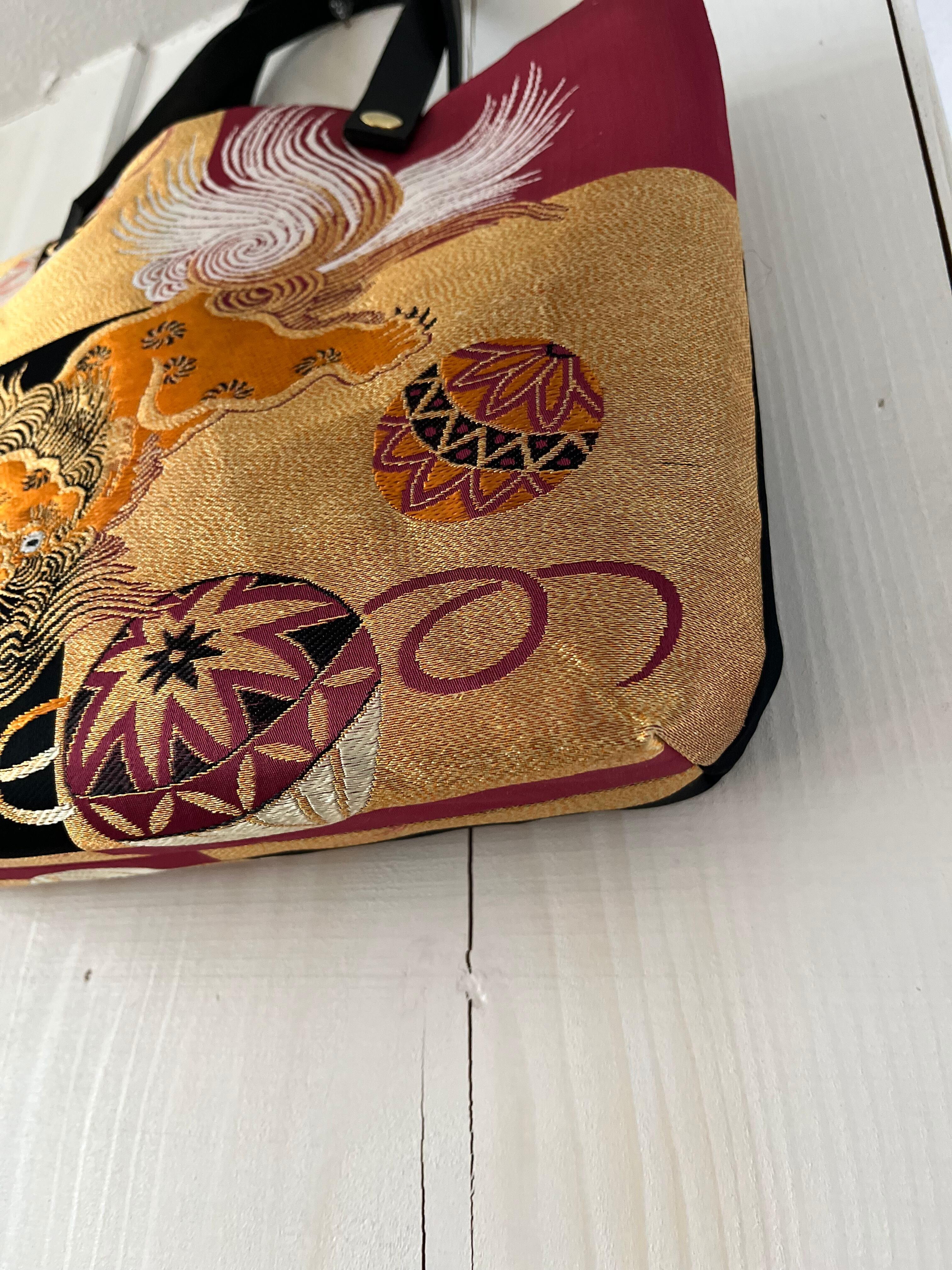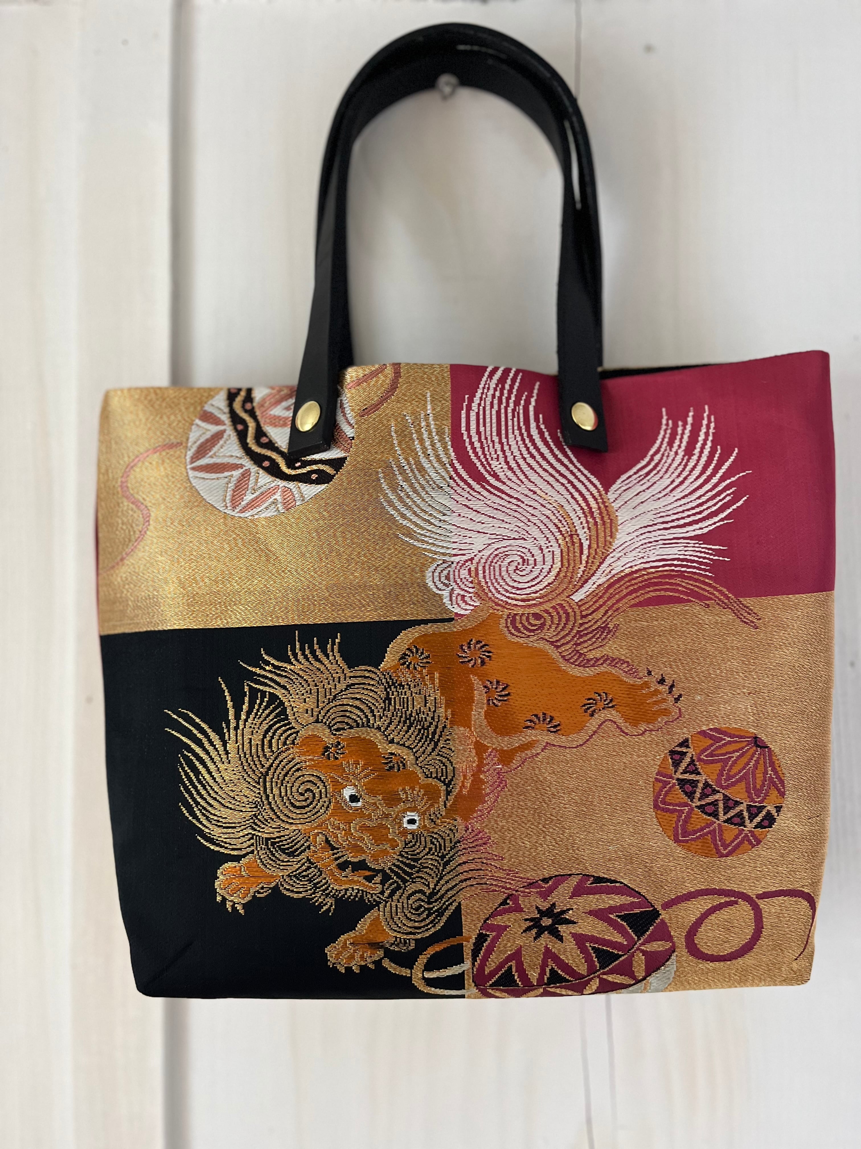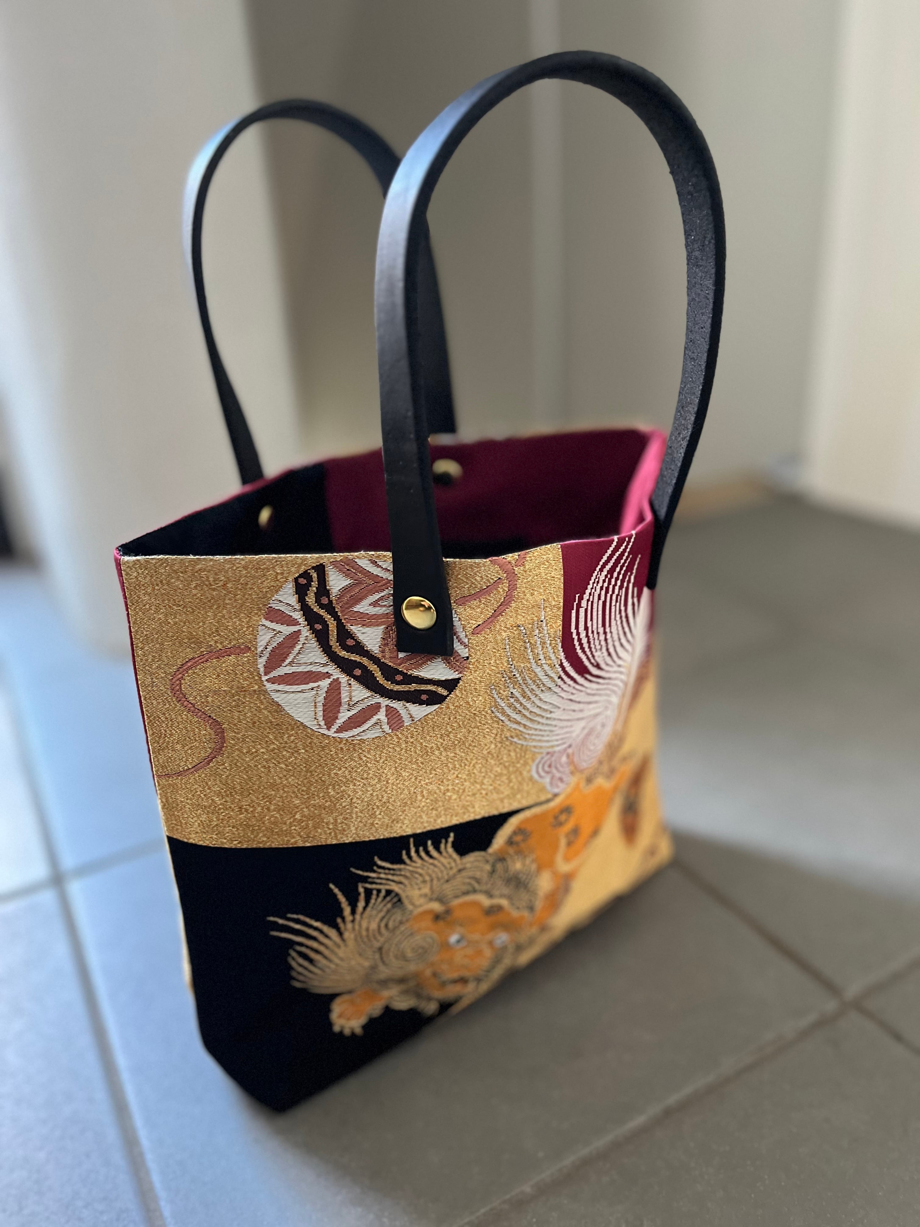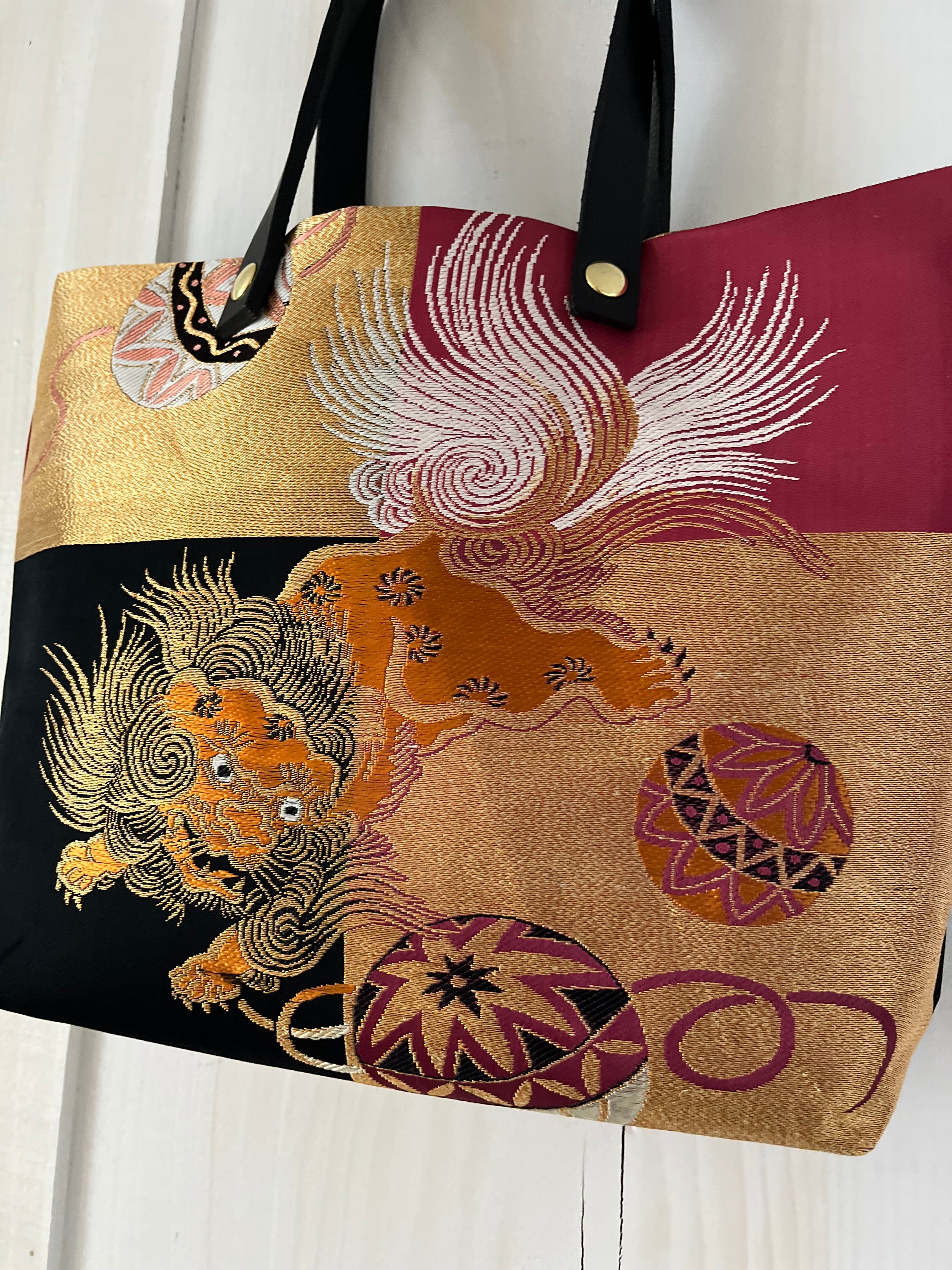 蹴鞠と獅子トート 帯レザーハンドルバック 着物リメイク
