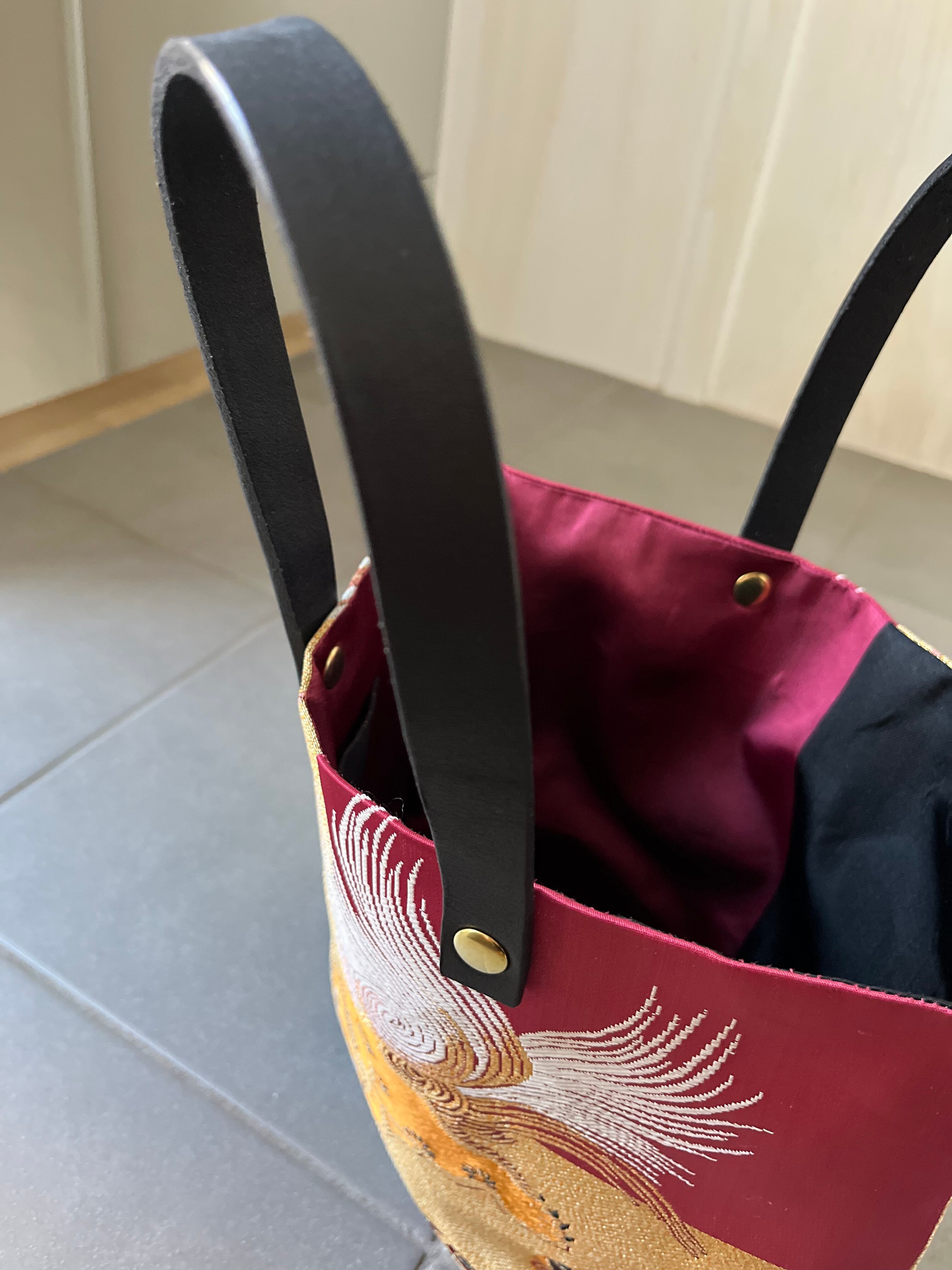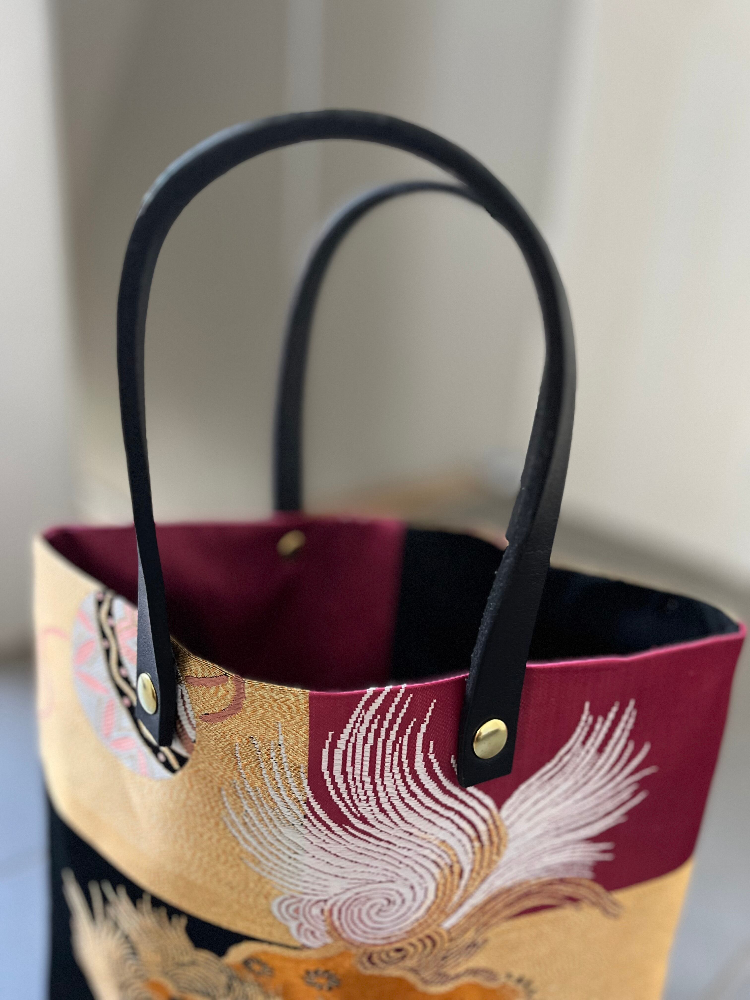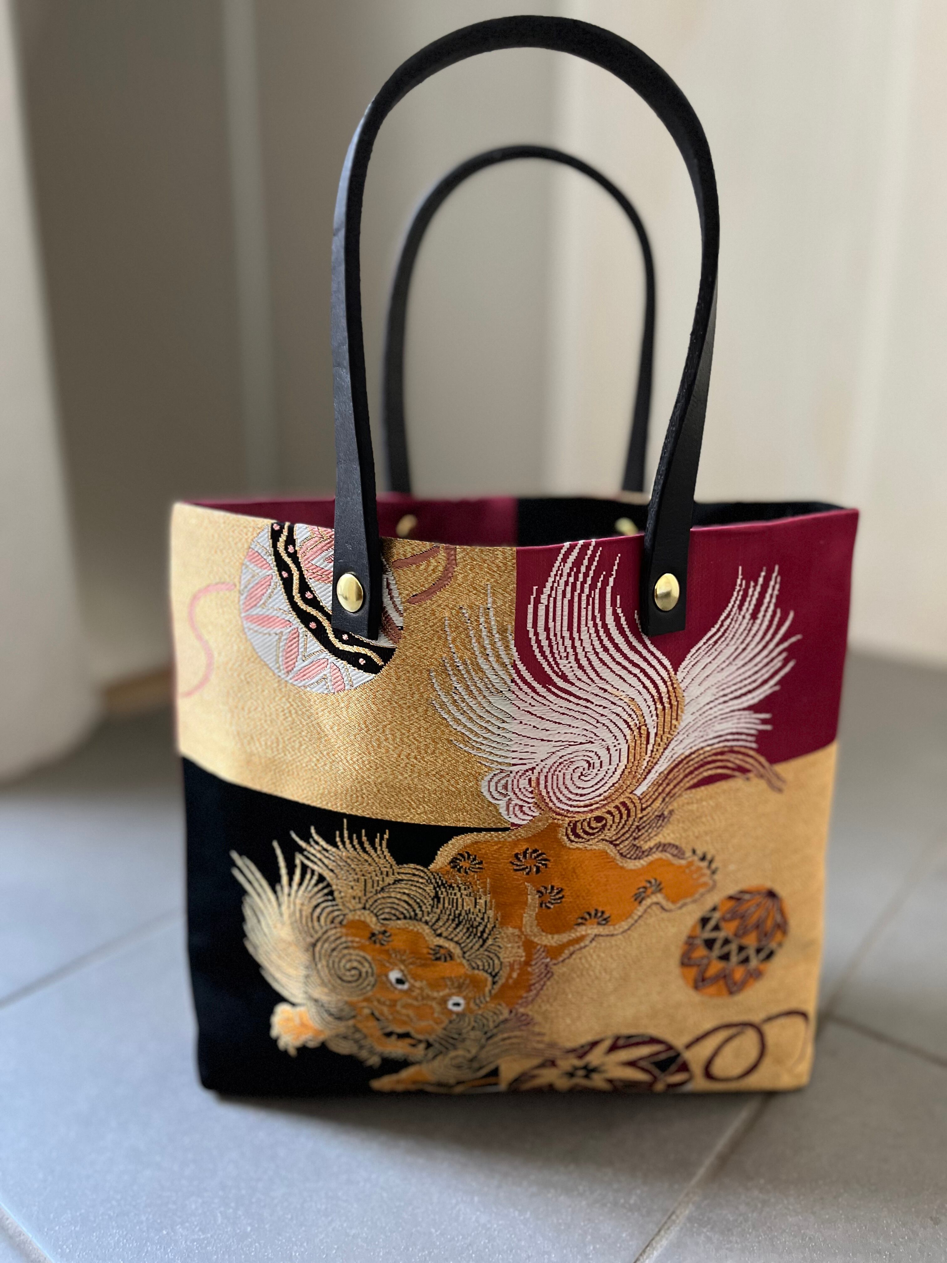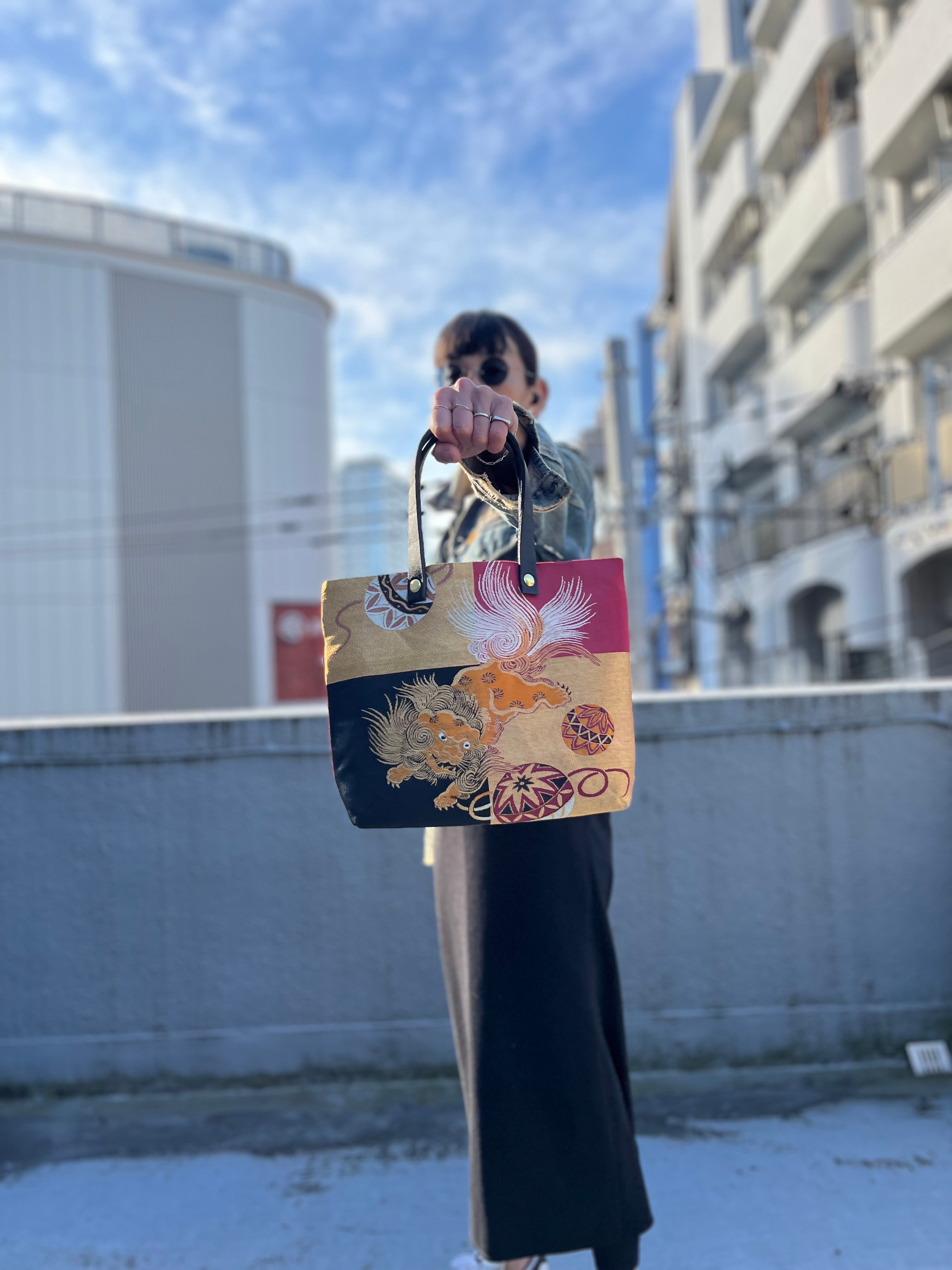 蹴鞠と獅子トート 帯レザーハンドルバック 着物リメイク