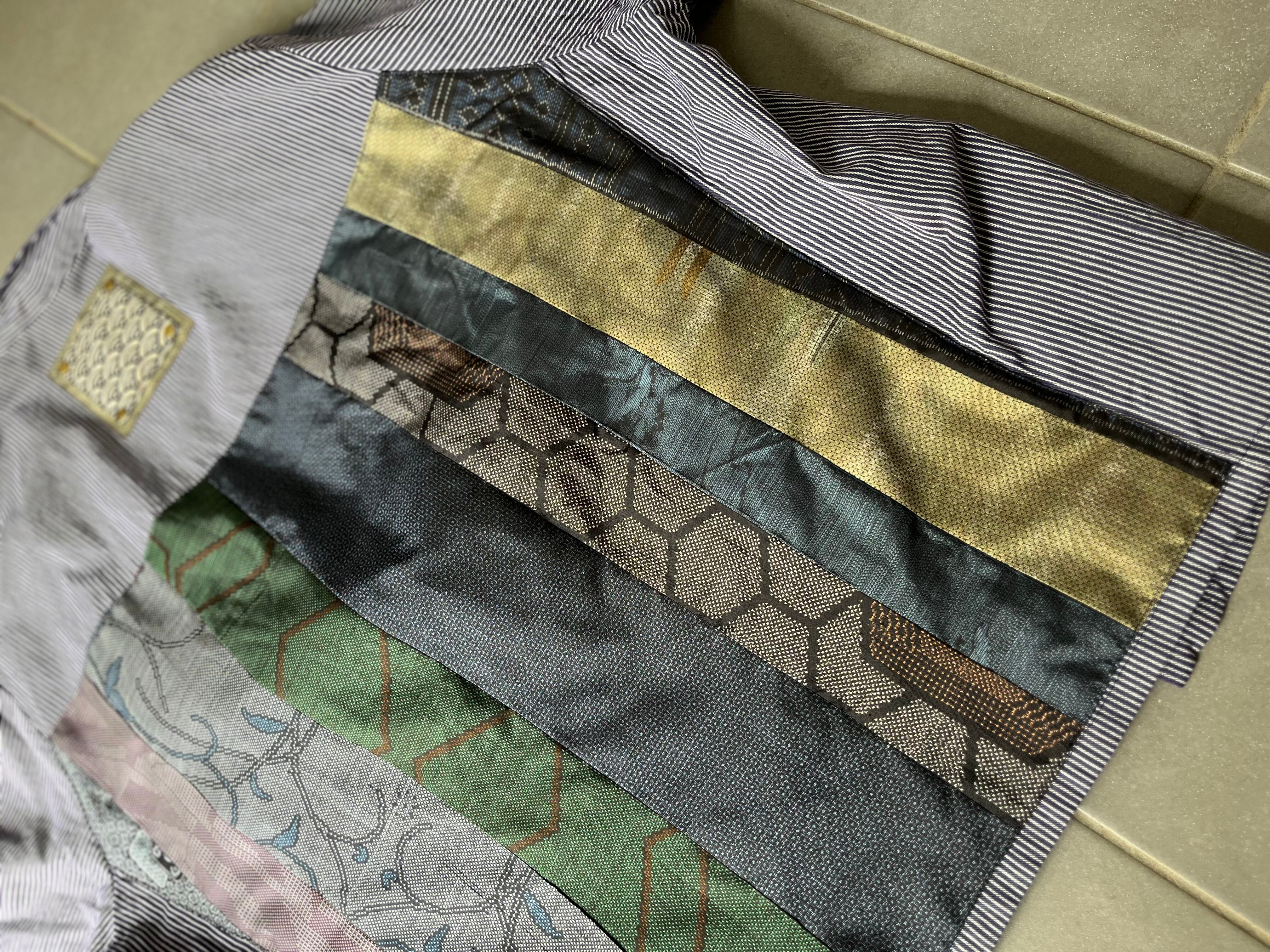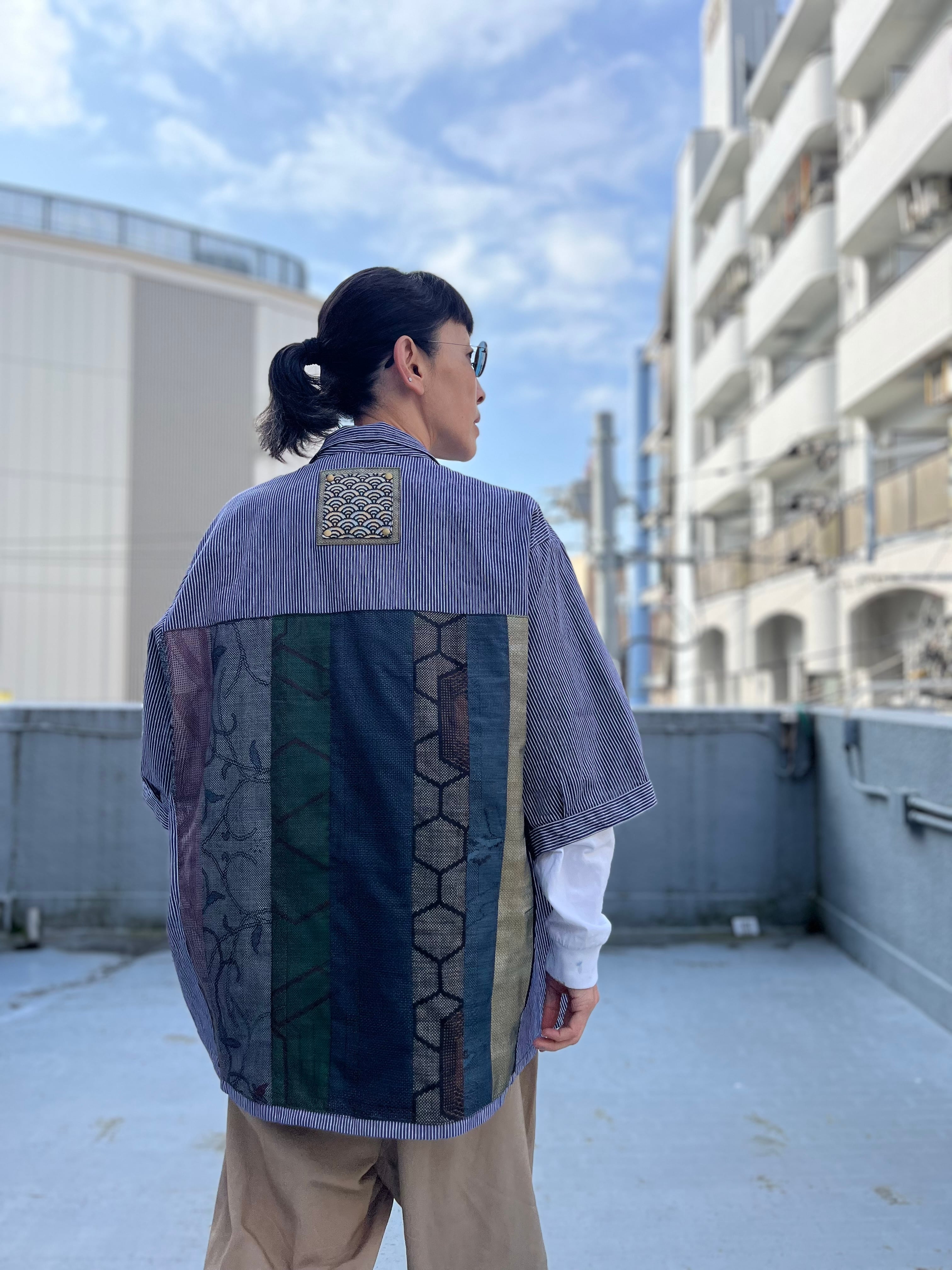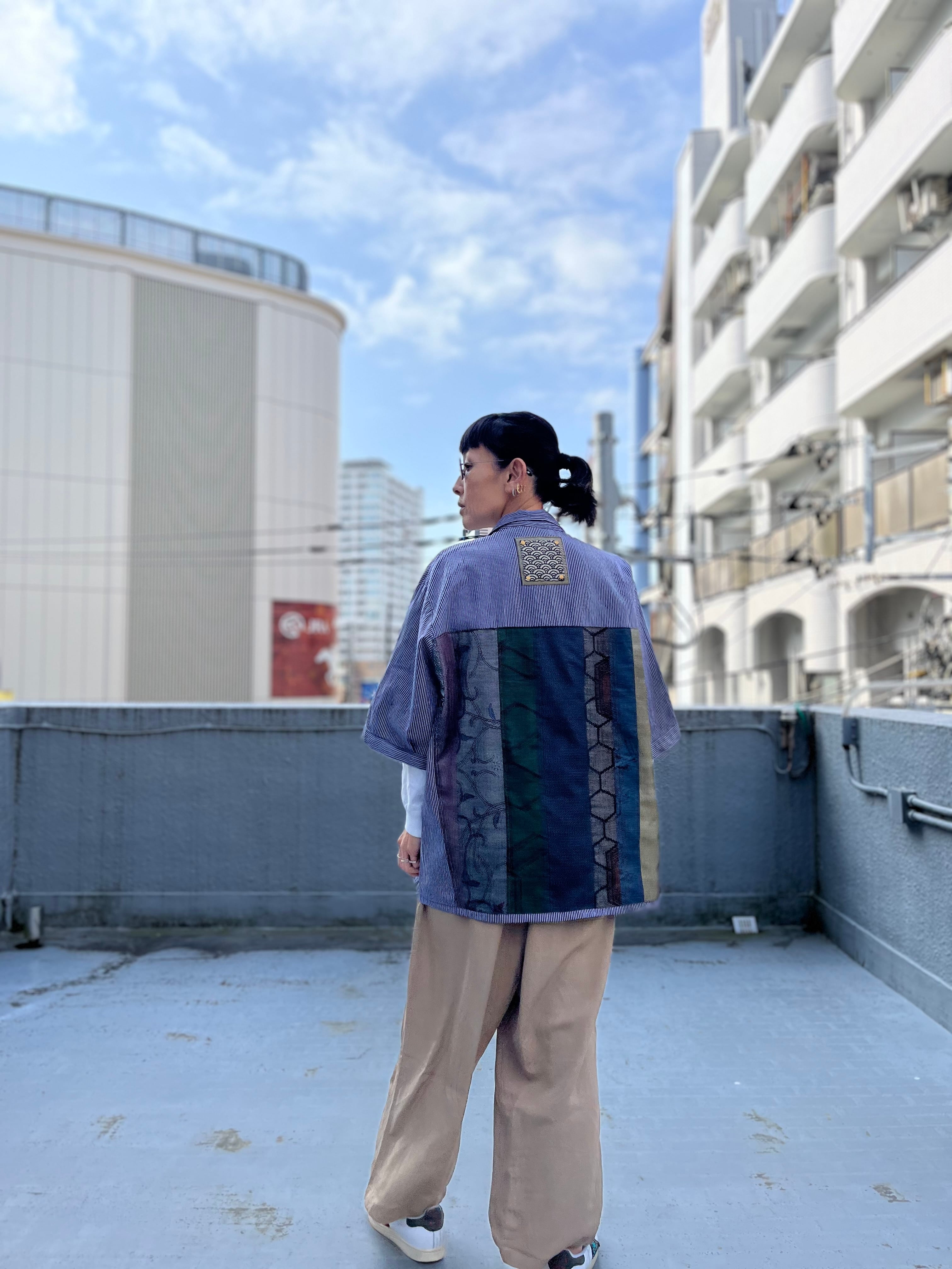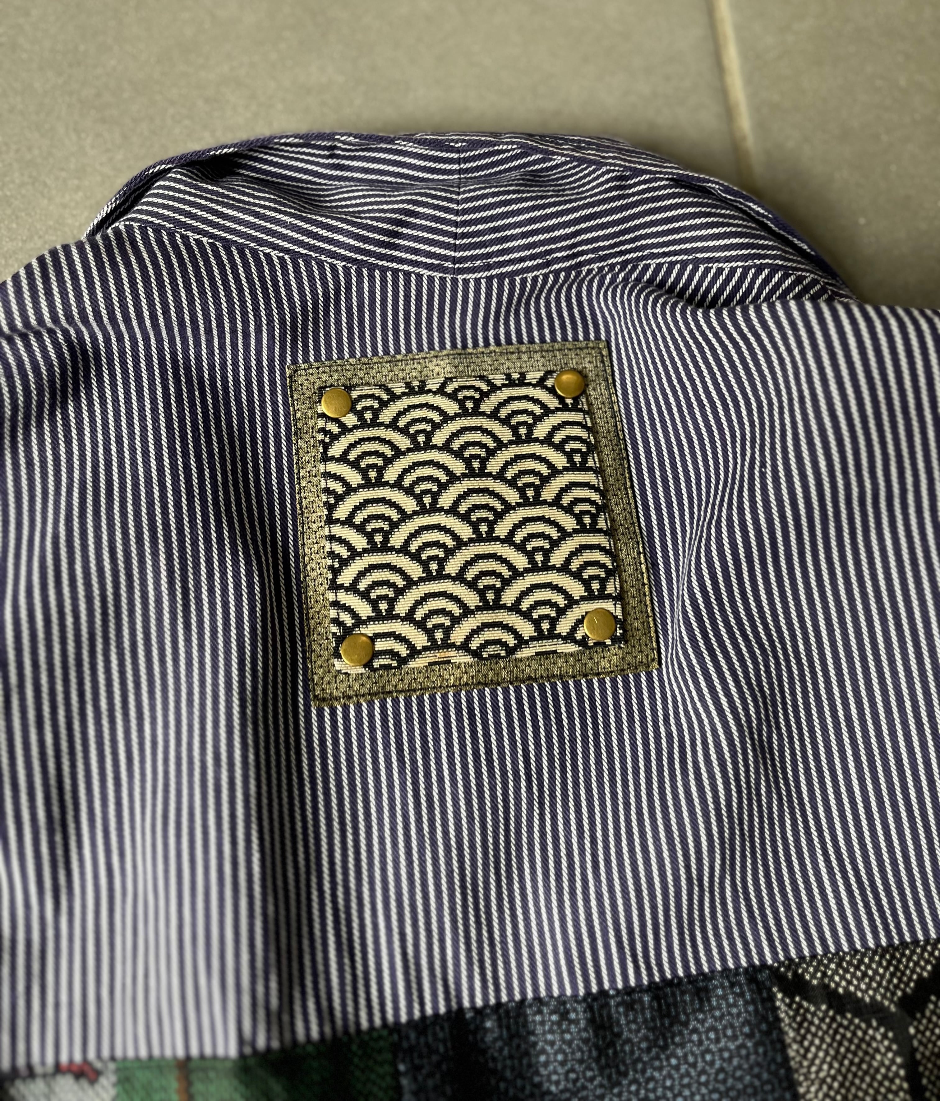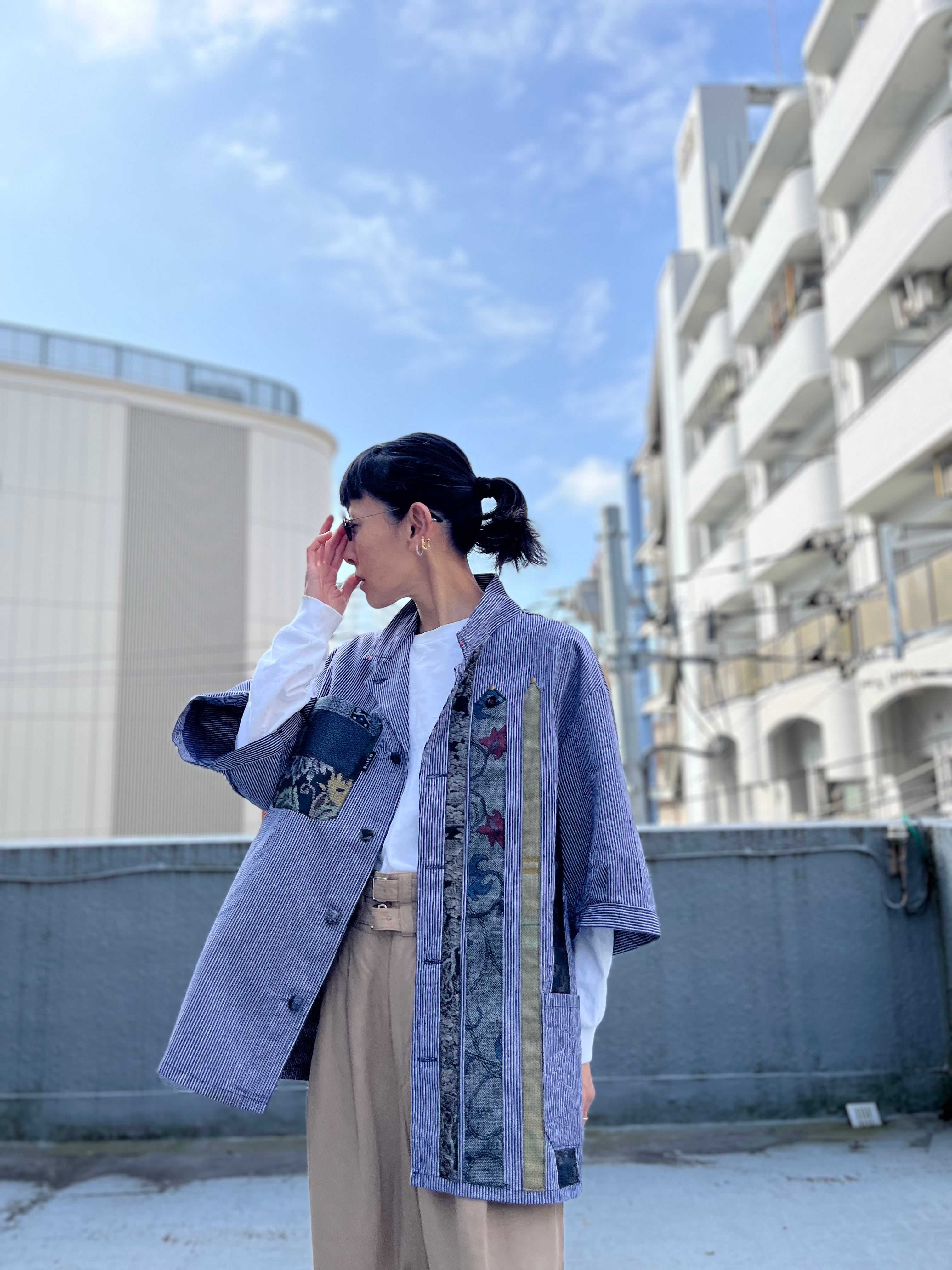 西と東の縞々JK 紬パッチワークコジャケット ユーロワークコート 着物パッチワークJK 着物リメイクJK