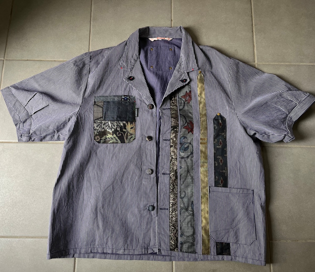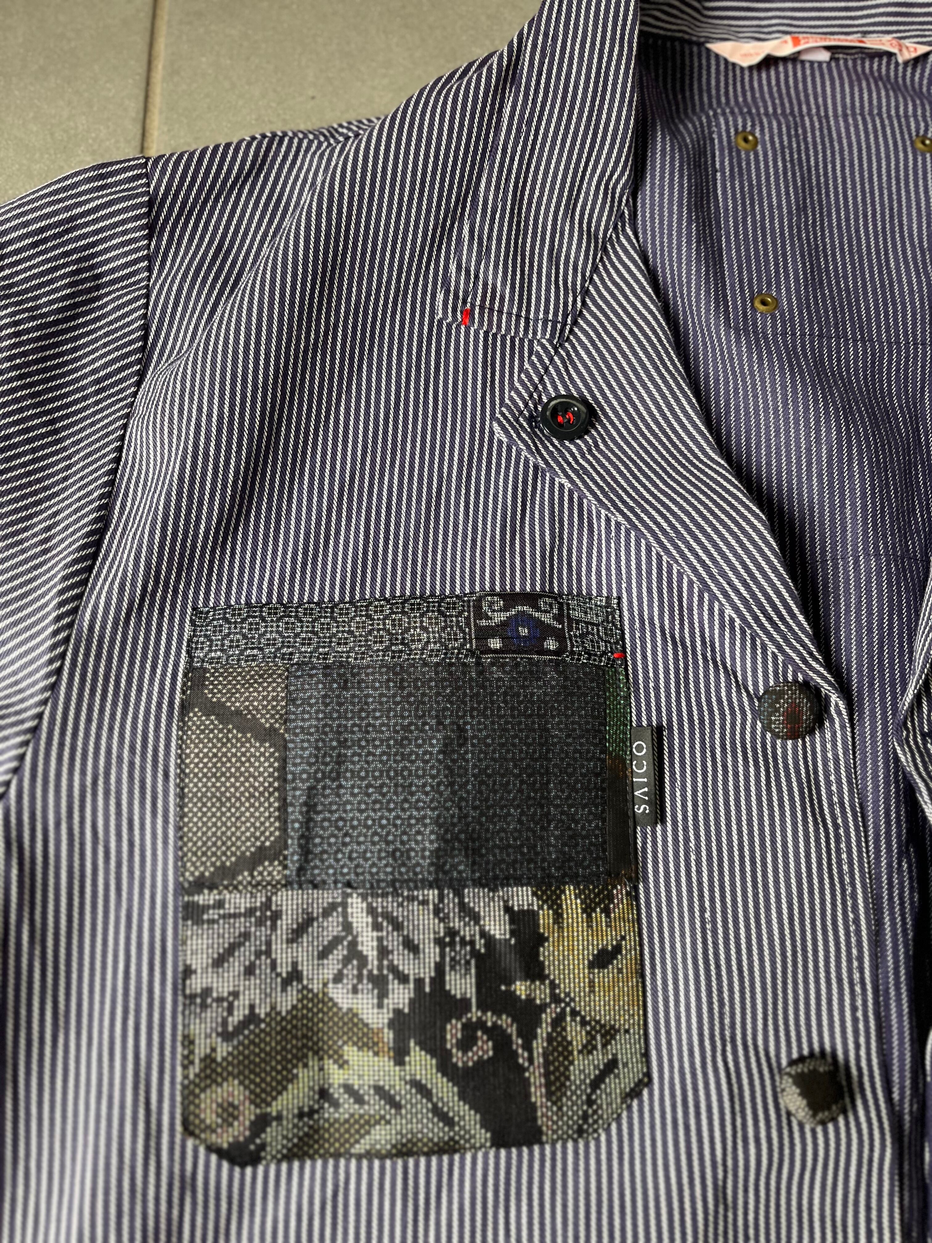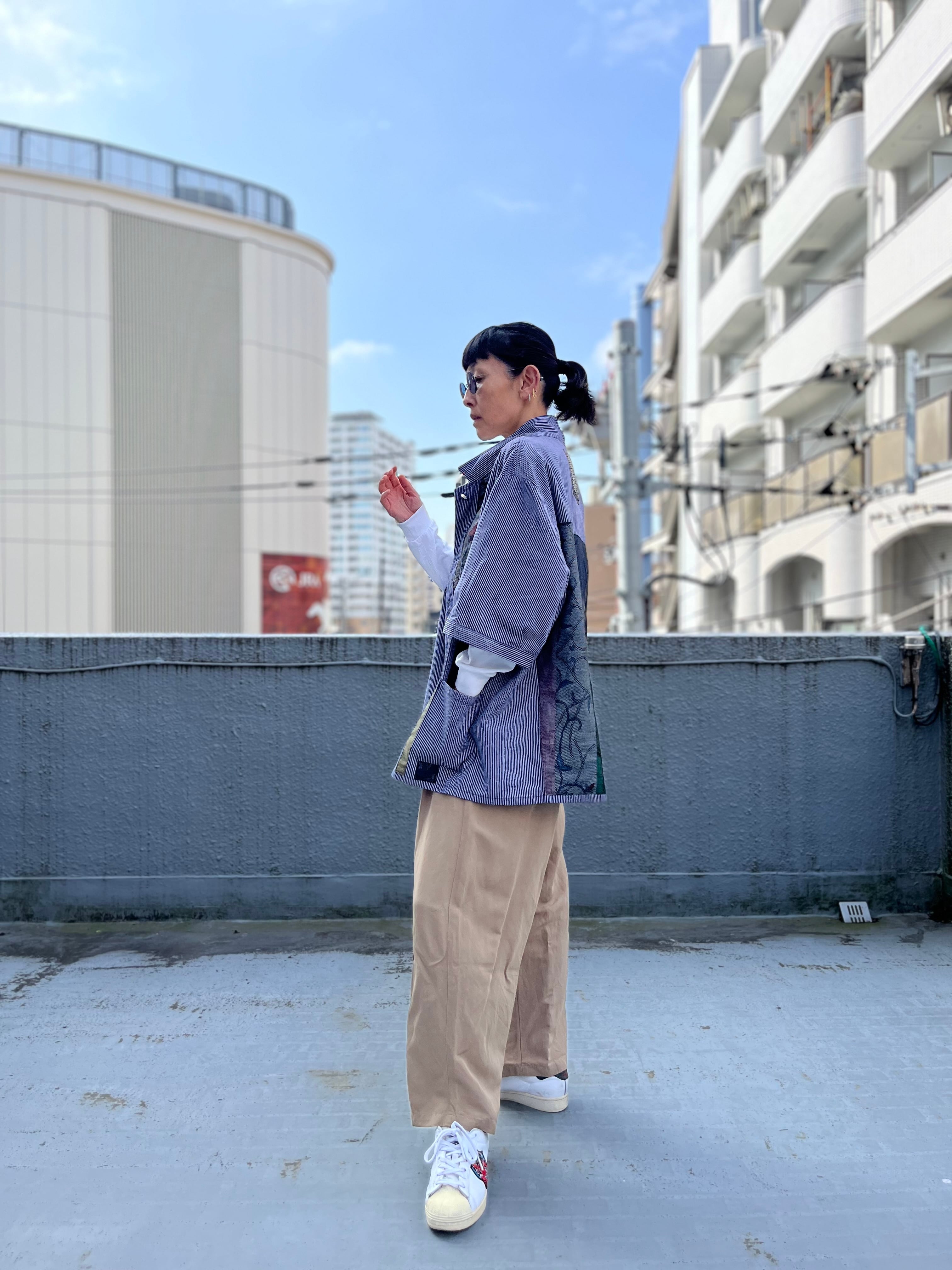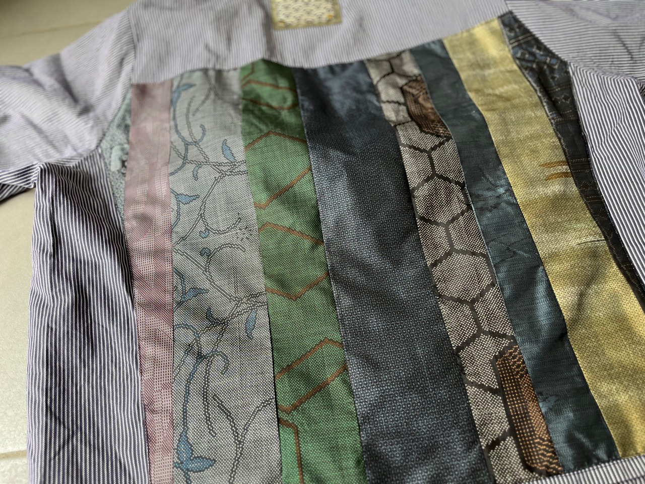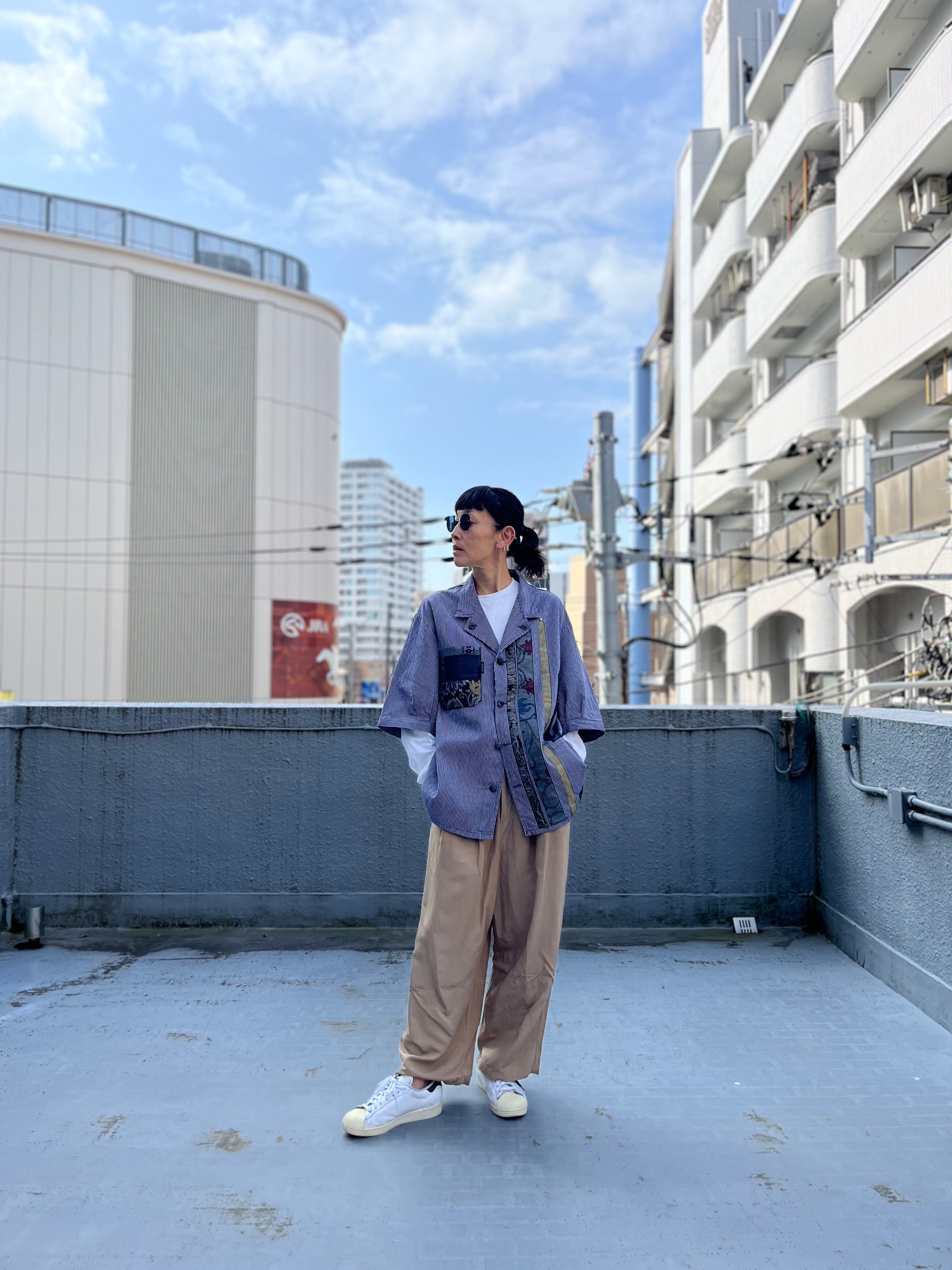 西と東の縞々JK 紬パッチワークコジャケット ユーロワークコート 着物パッチワークJK 着物リメイクJK