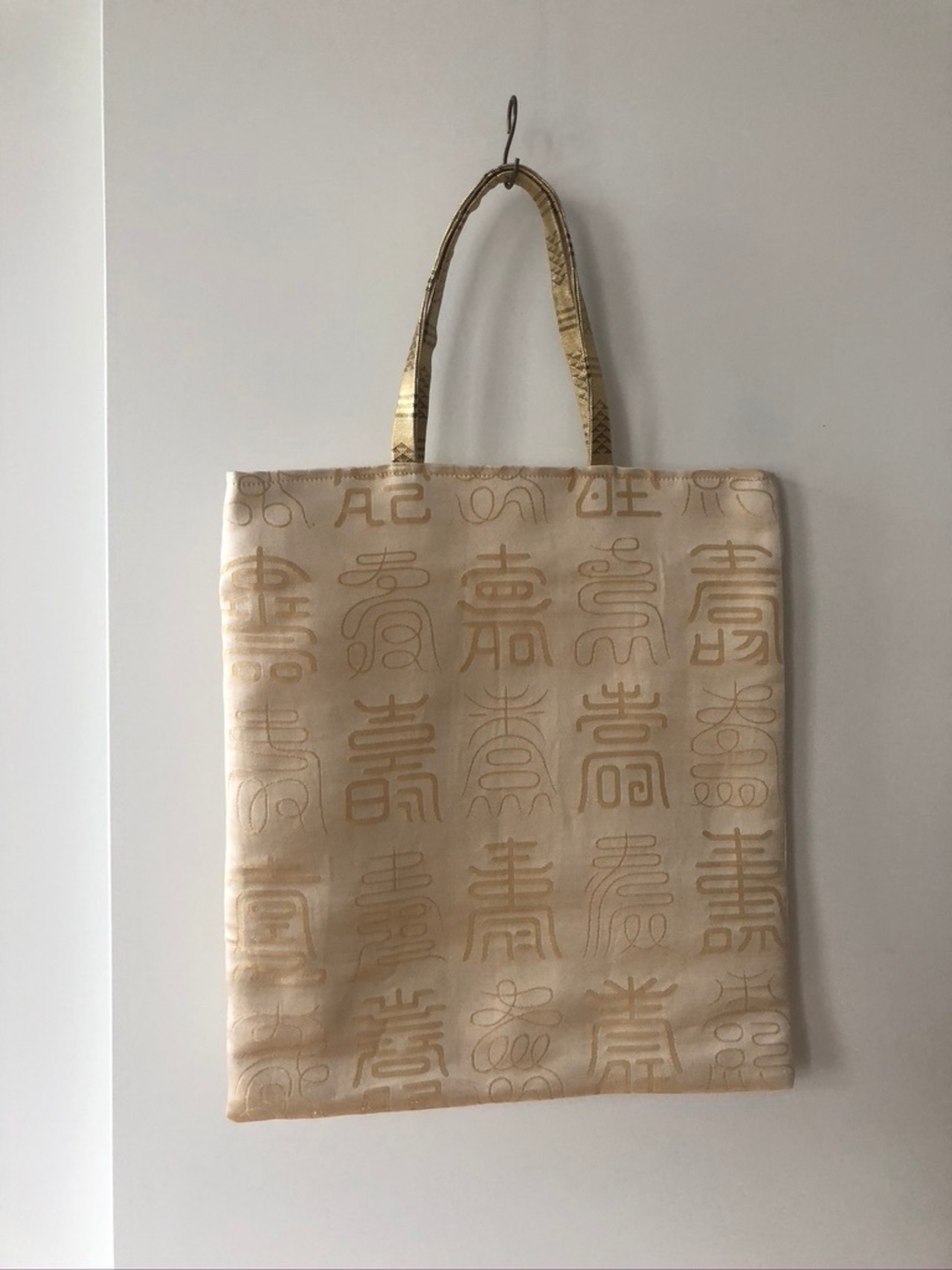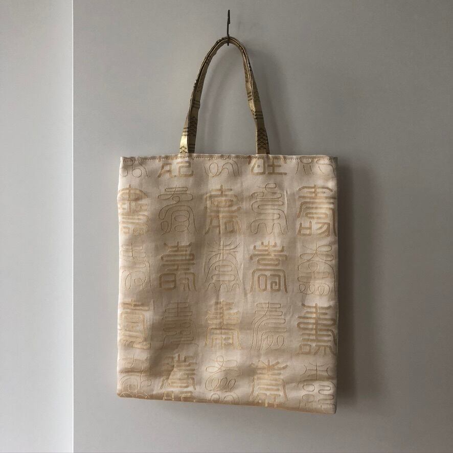 金文字の寿紋様の袋帯をreuseハンドルは三つ鱗柄の金の帯締