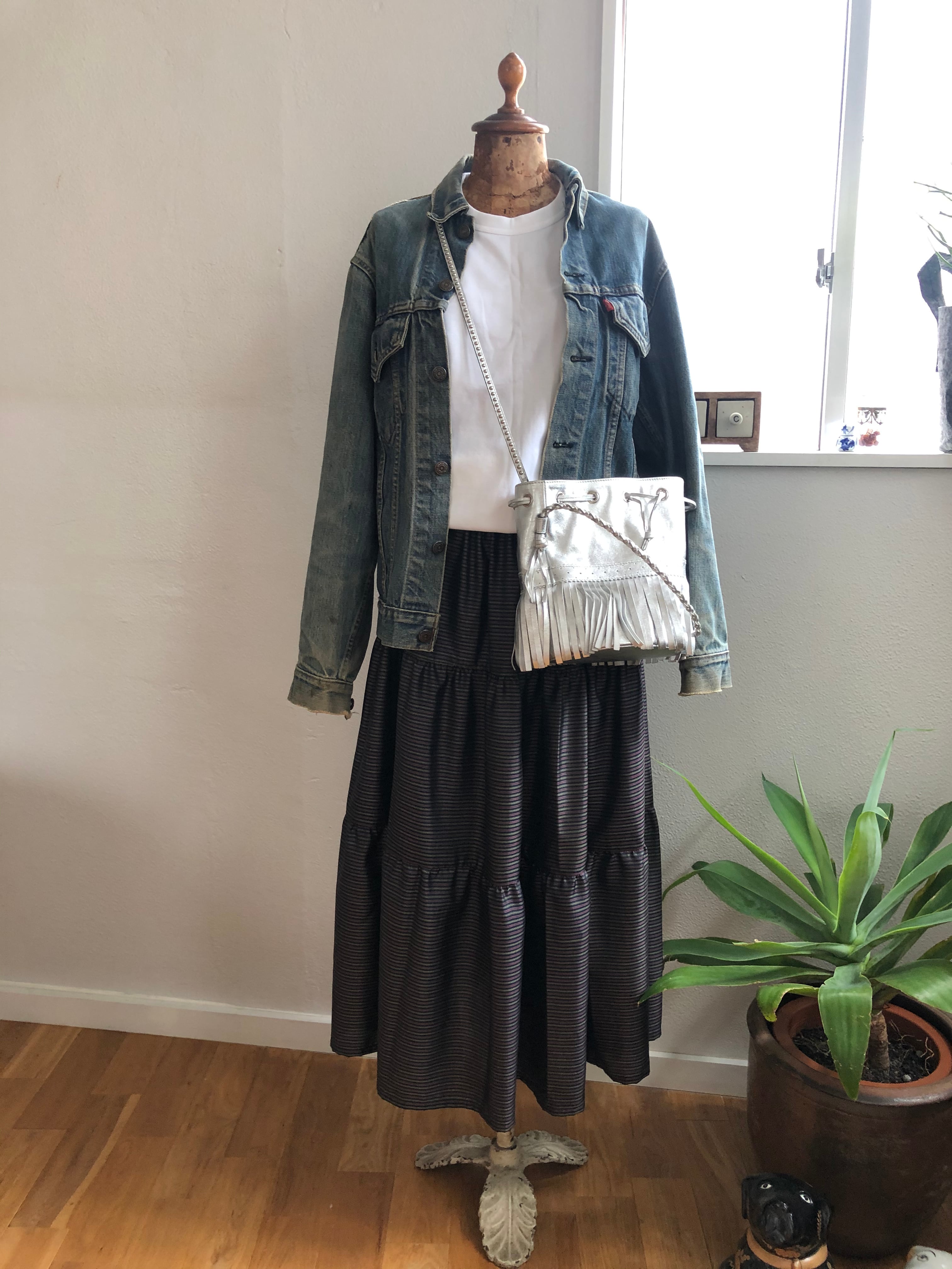 It's mother's job after along time.Tiered skirt made by "Tsumugi-Kimono".Tsumugi is very light & delicate but very durable.Rubbing the cloth makes a unique sound , which we call "kinu-zure".Wearing this skirt makes a pleasant "kinu-zure"..