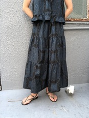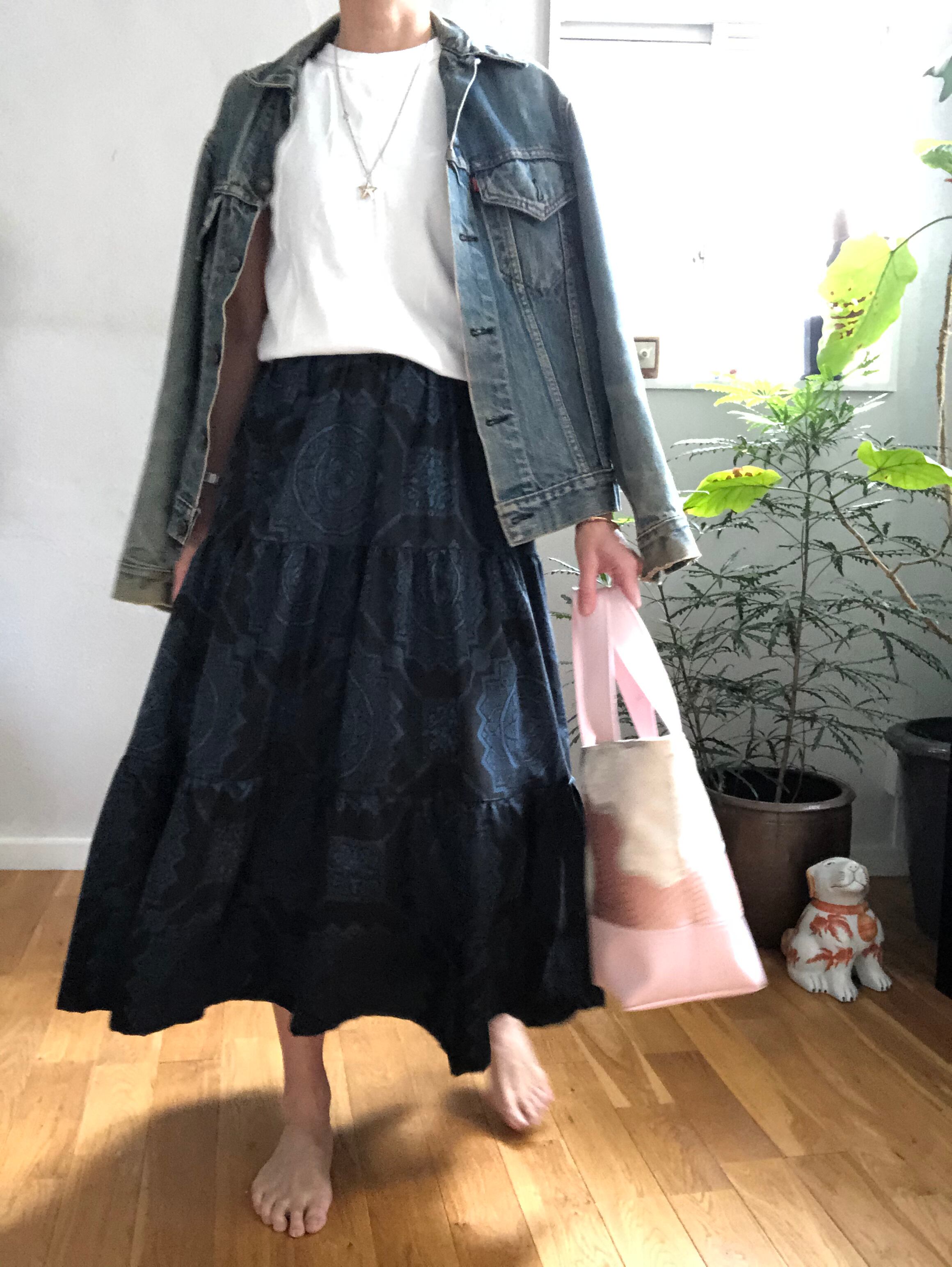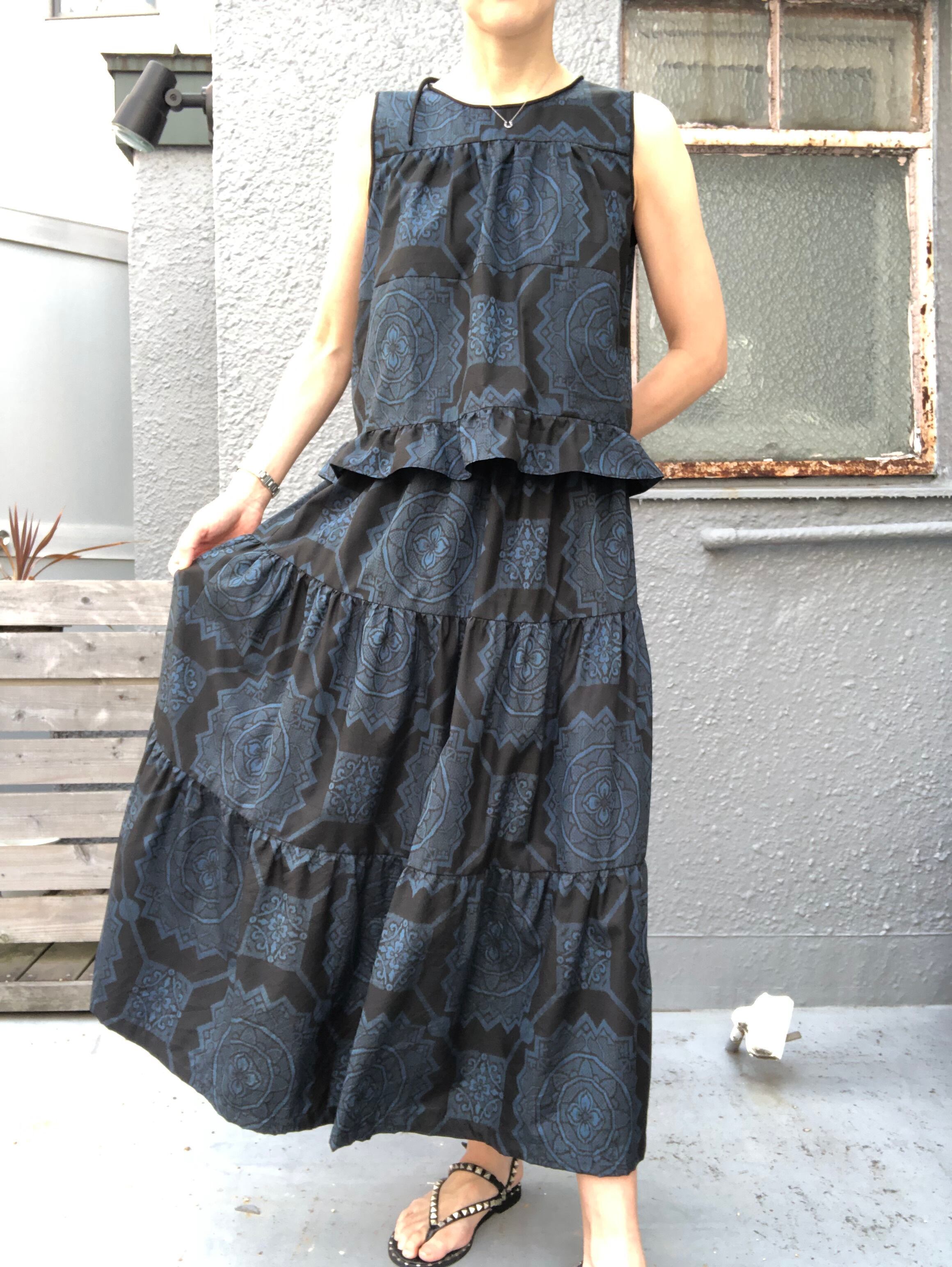 It's mother's job after along time.Tiered skirt made by "Tsumugi-Kimono".Tsumugi is very light & delicate but very durable.Rubbing the cloth makes a unique sound , which we call "kinu-zure".Wearing this skirt makes a pleasant "kinu-zure"..