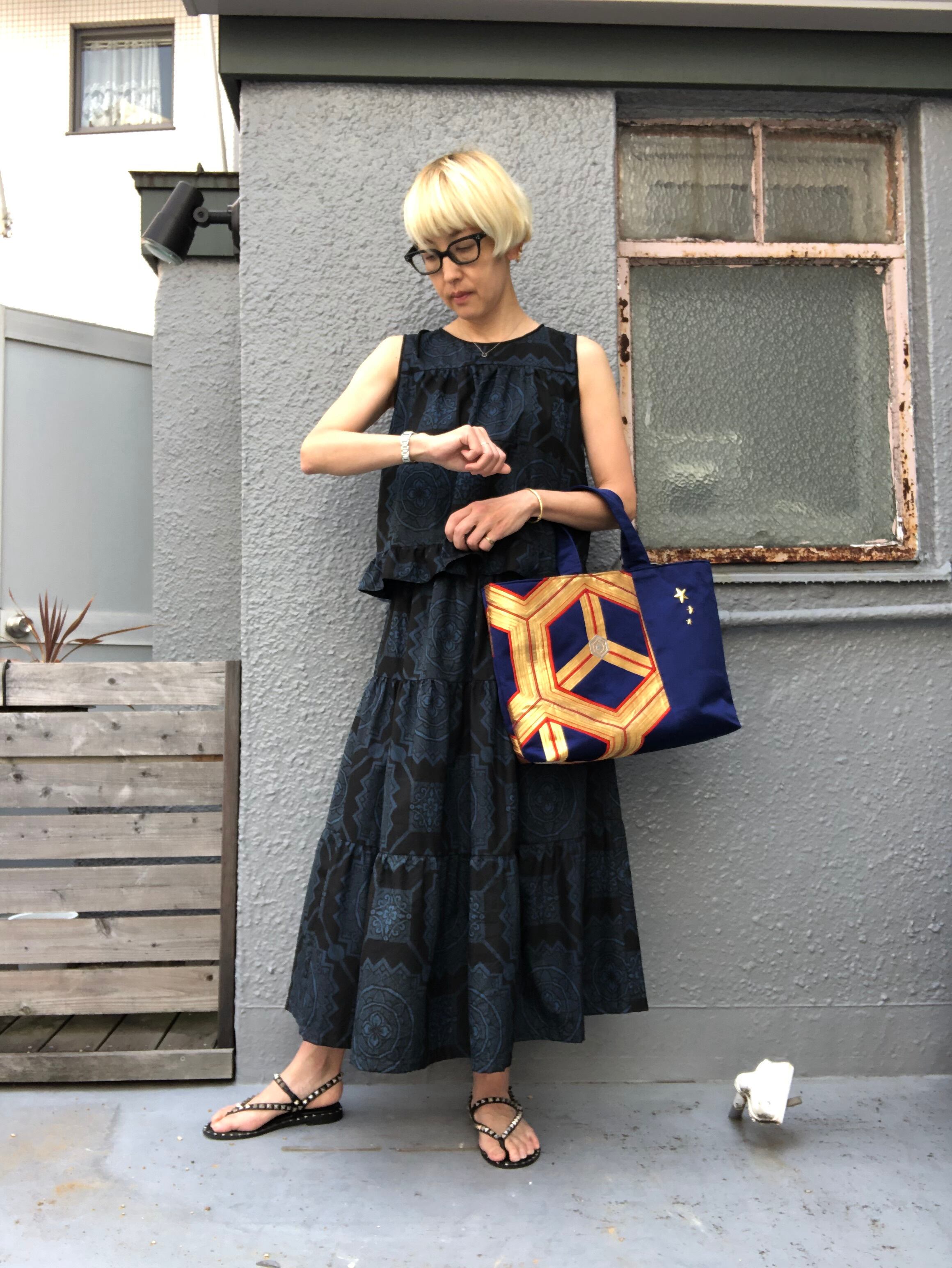 It's mother's job after along time.Tiered skirt made by "Tsumugi-Kimono".Tsumugi is very light & delicate but very durable.Rubbing the cloth makes a unique sound , which we call "kinu-zure".Wearing this skirt makes a pleasant "kinu-zure"..