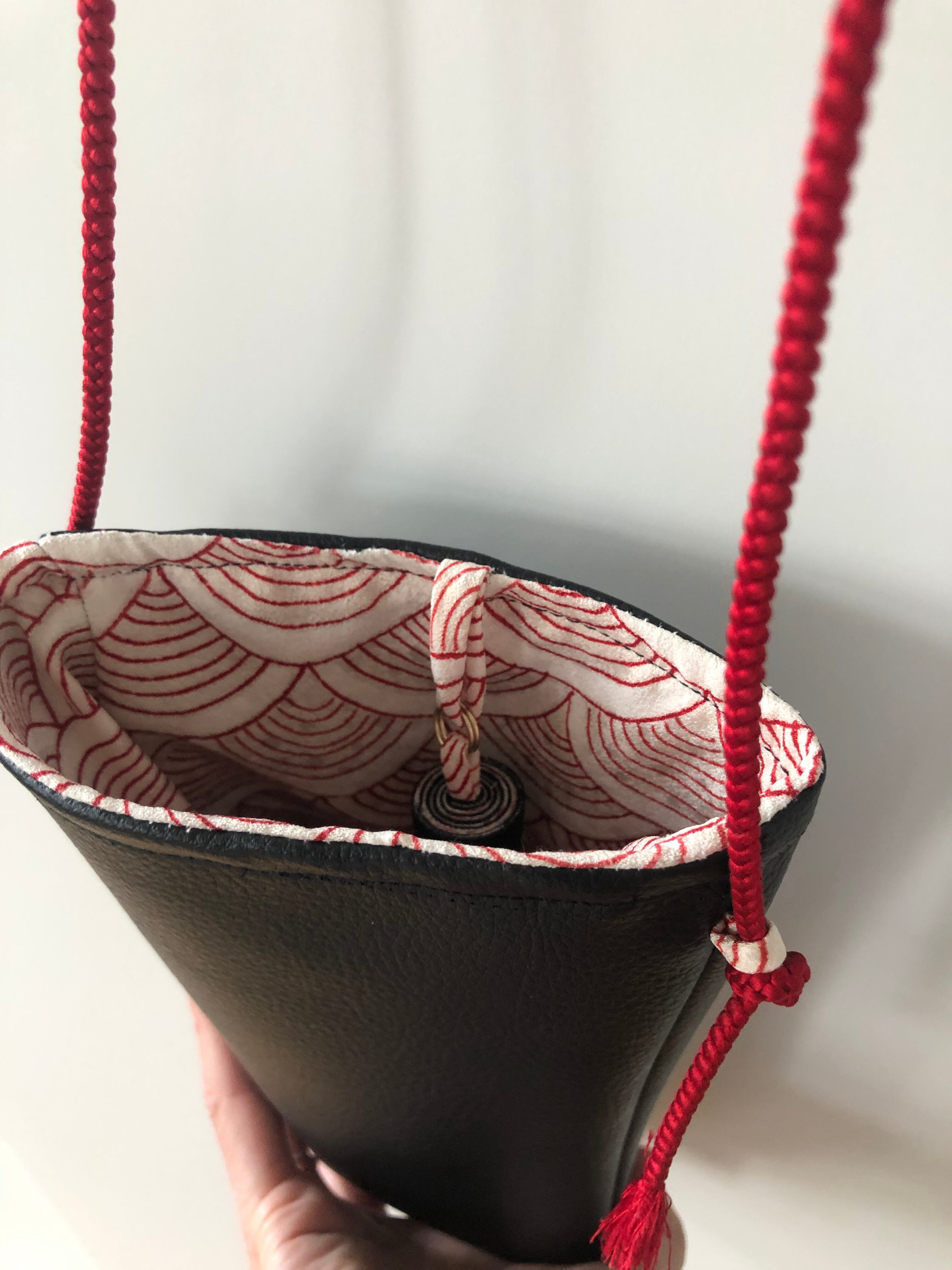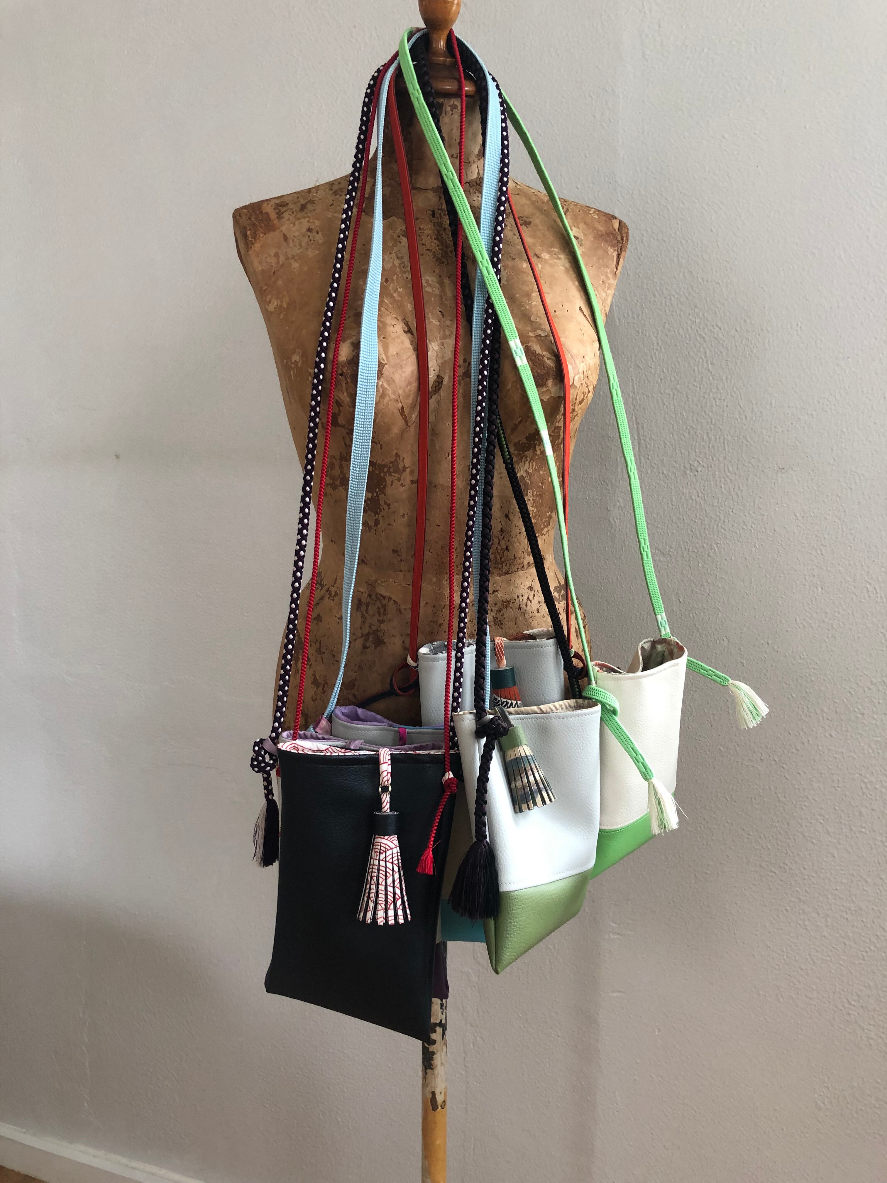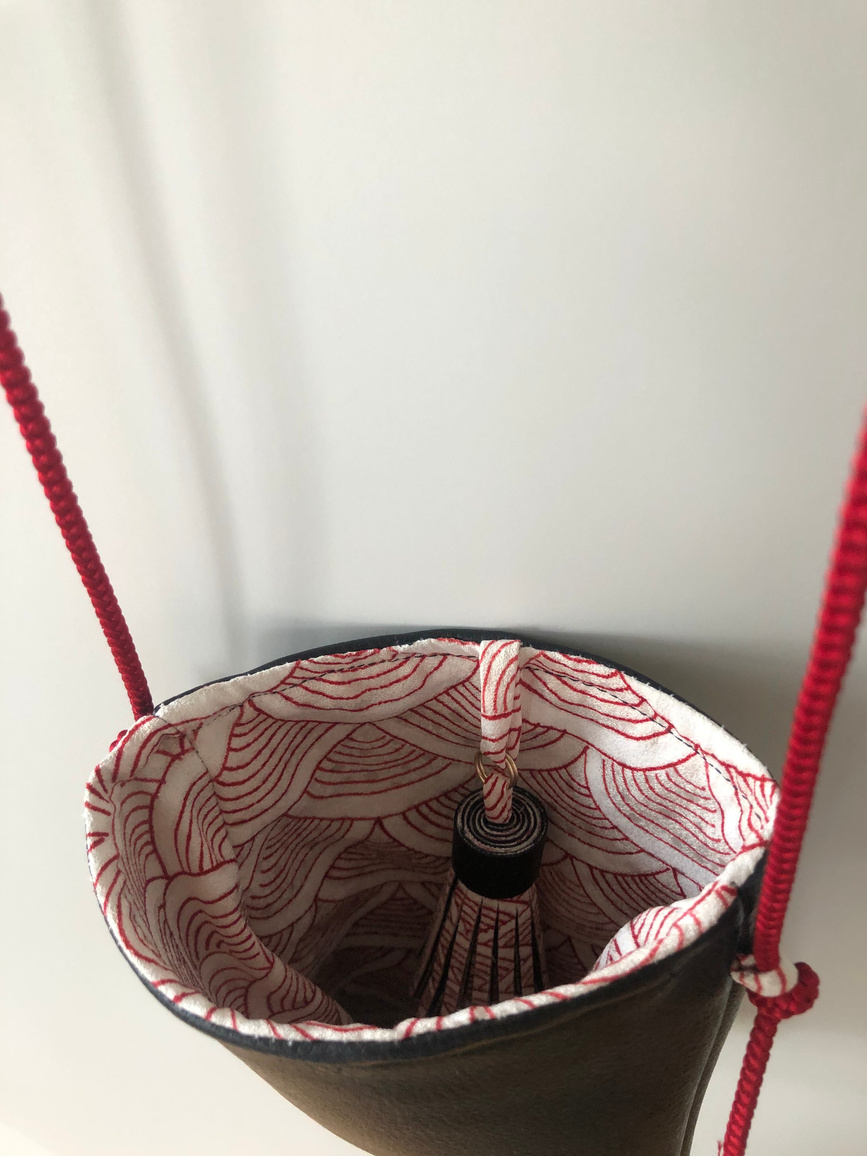 帯締ストラップサコッシュ エコレザー&青海波小紋リユース BA.REN タッセル付 着物リメイク