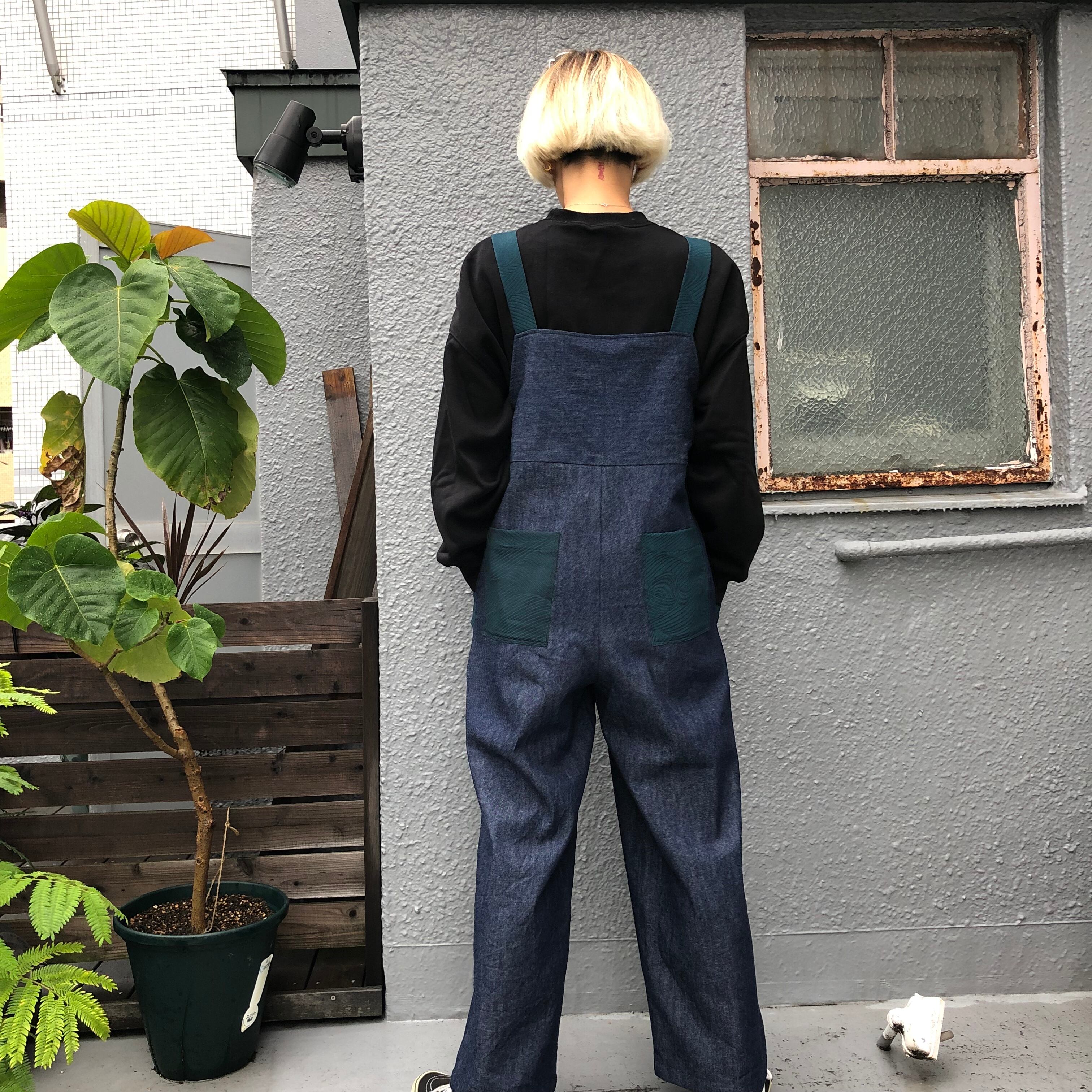着物リユース×デニム ビックポケットサロペット 1点もの 古着リメイク 着物リメイク