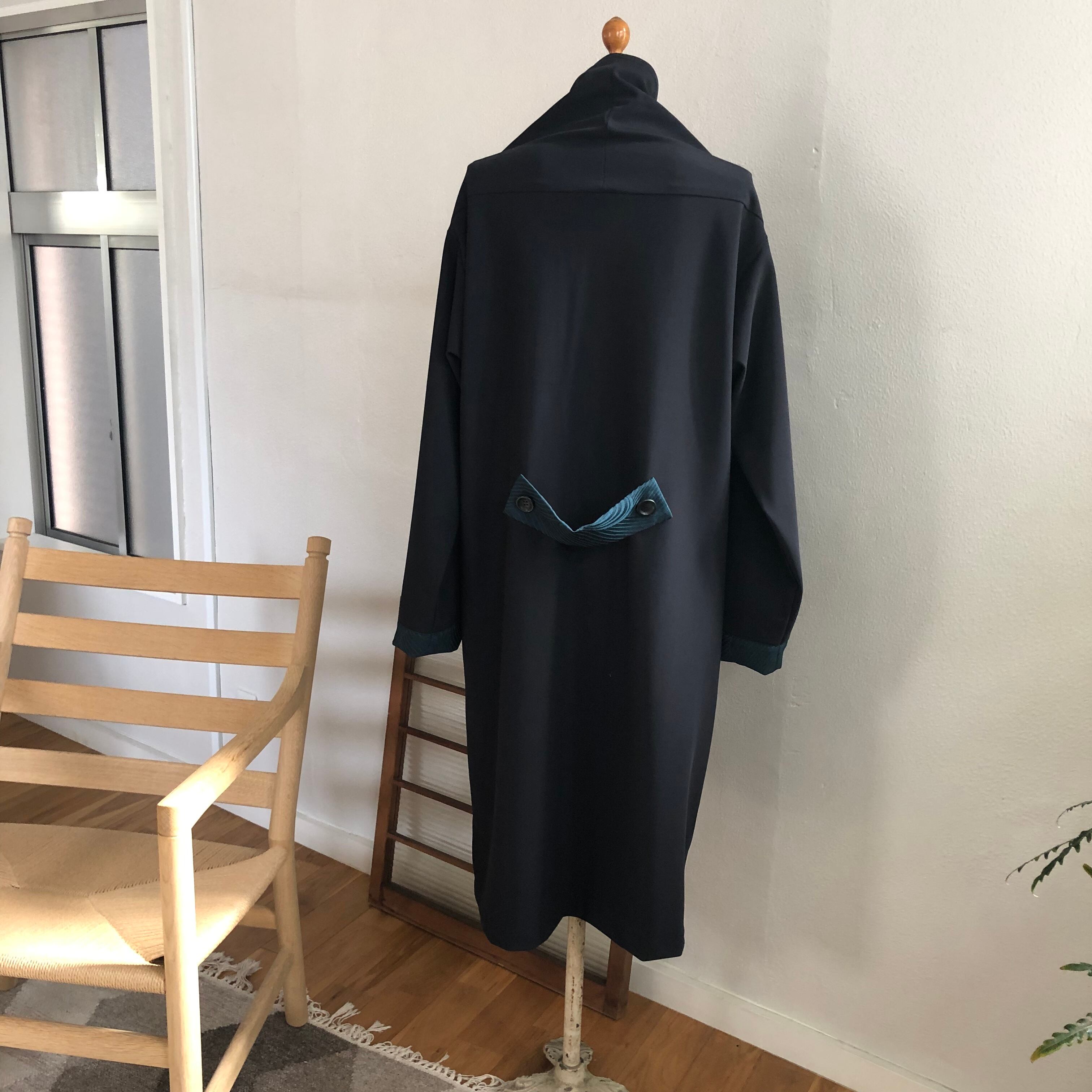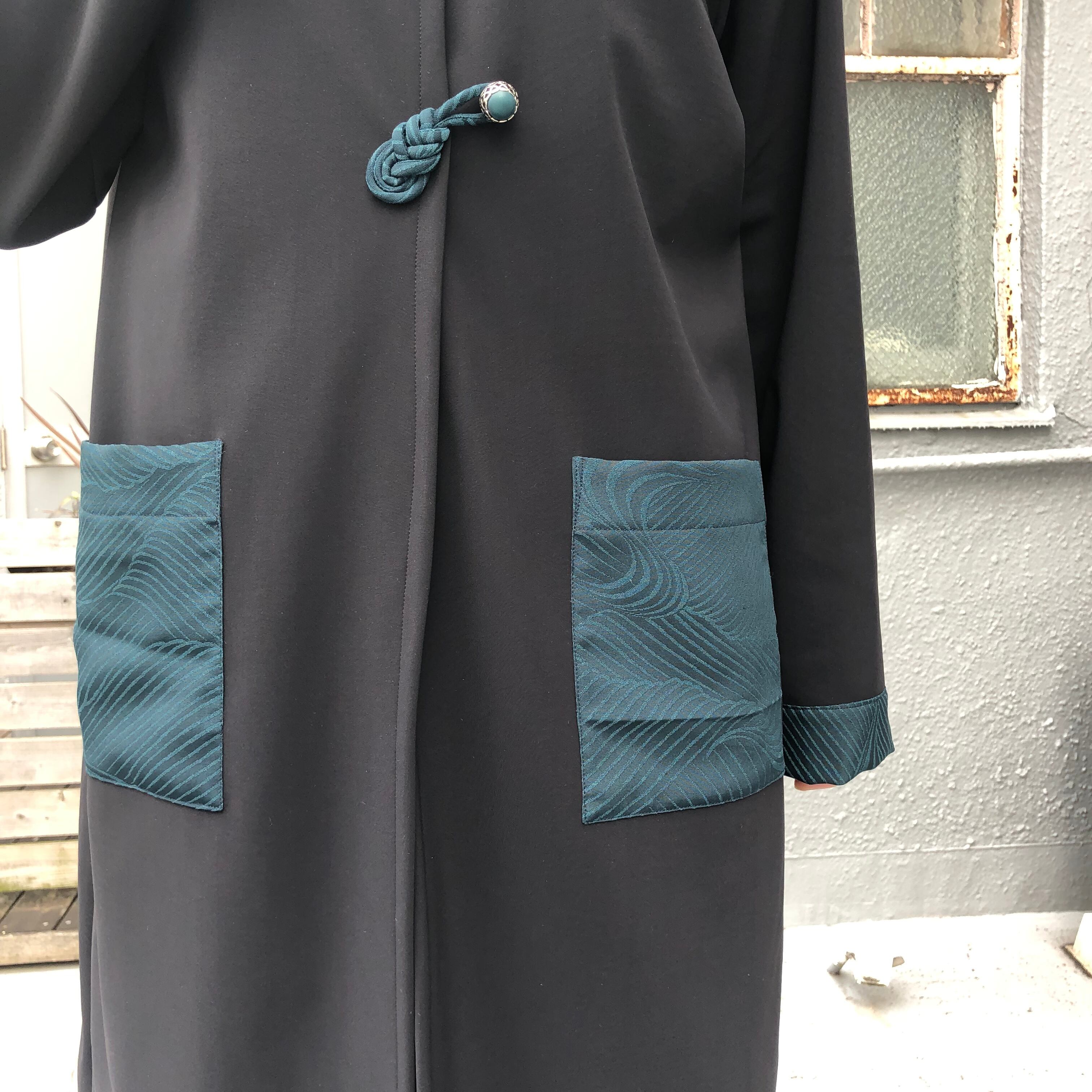 ターコイズブルーの波の透かし模様の着物をリユースしたポケットと袖にカフスを
