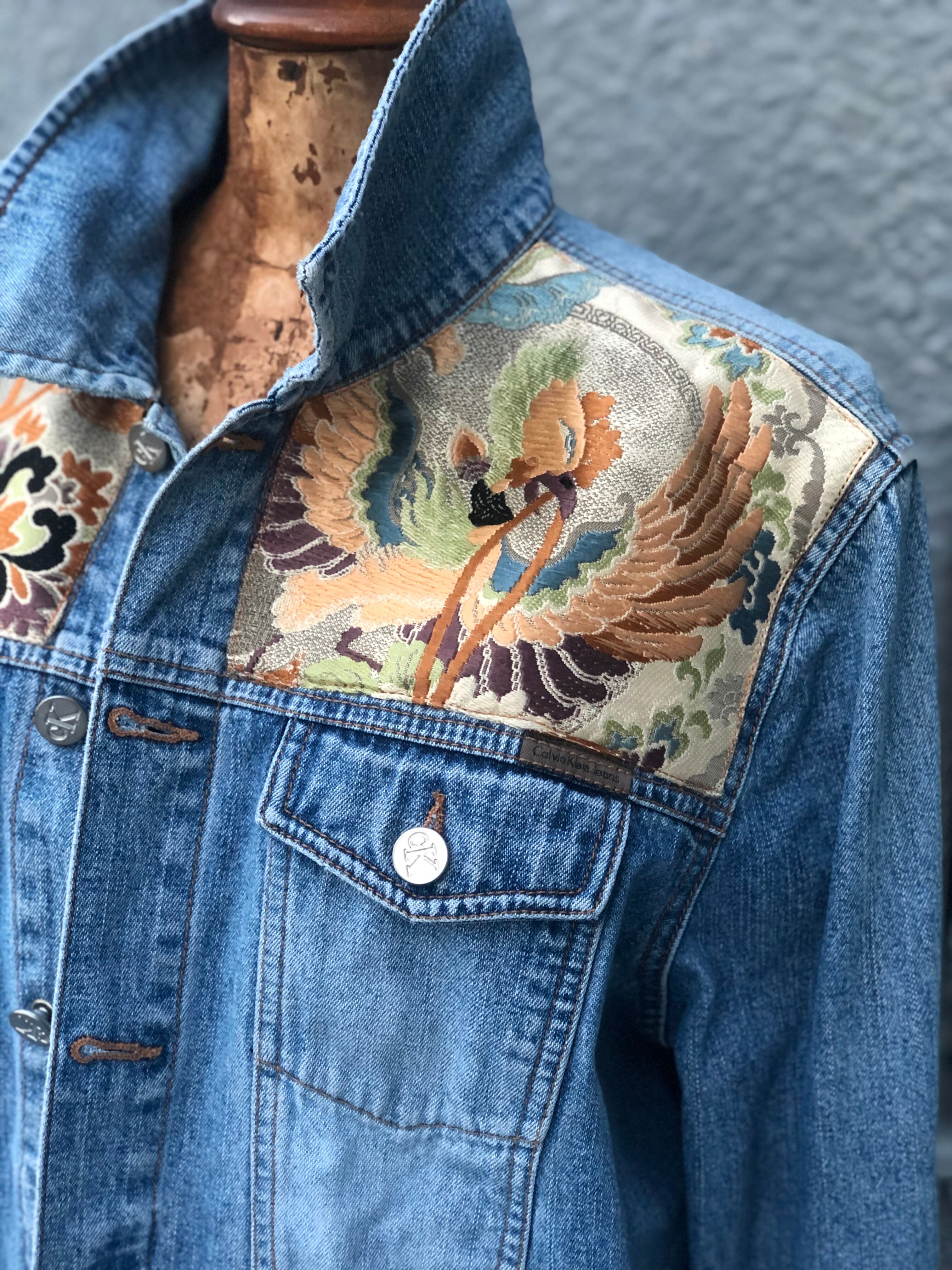 軍配扇獅子&鳳凰のアンティーク帯とUSEDカルバンクライGジャンのリユースリミックス