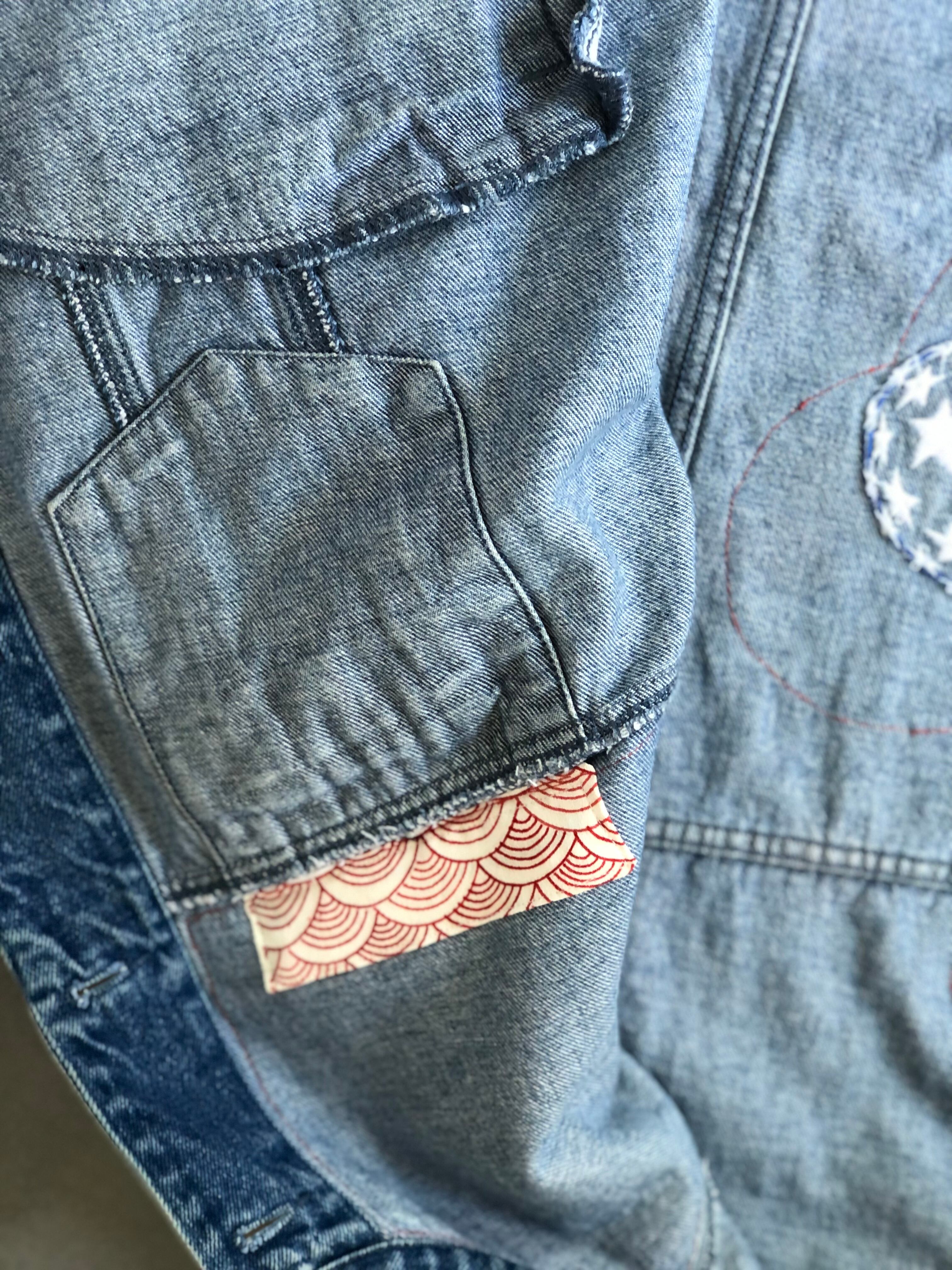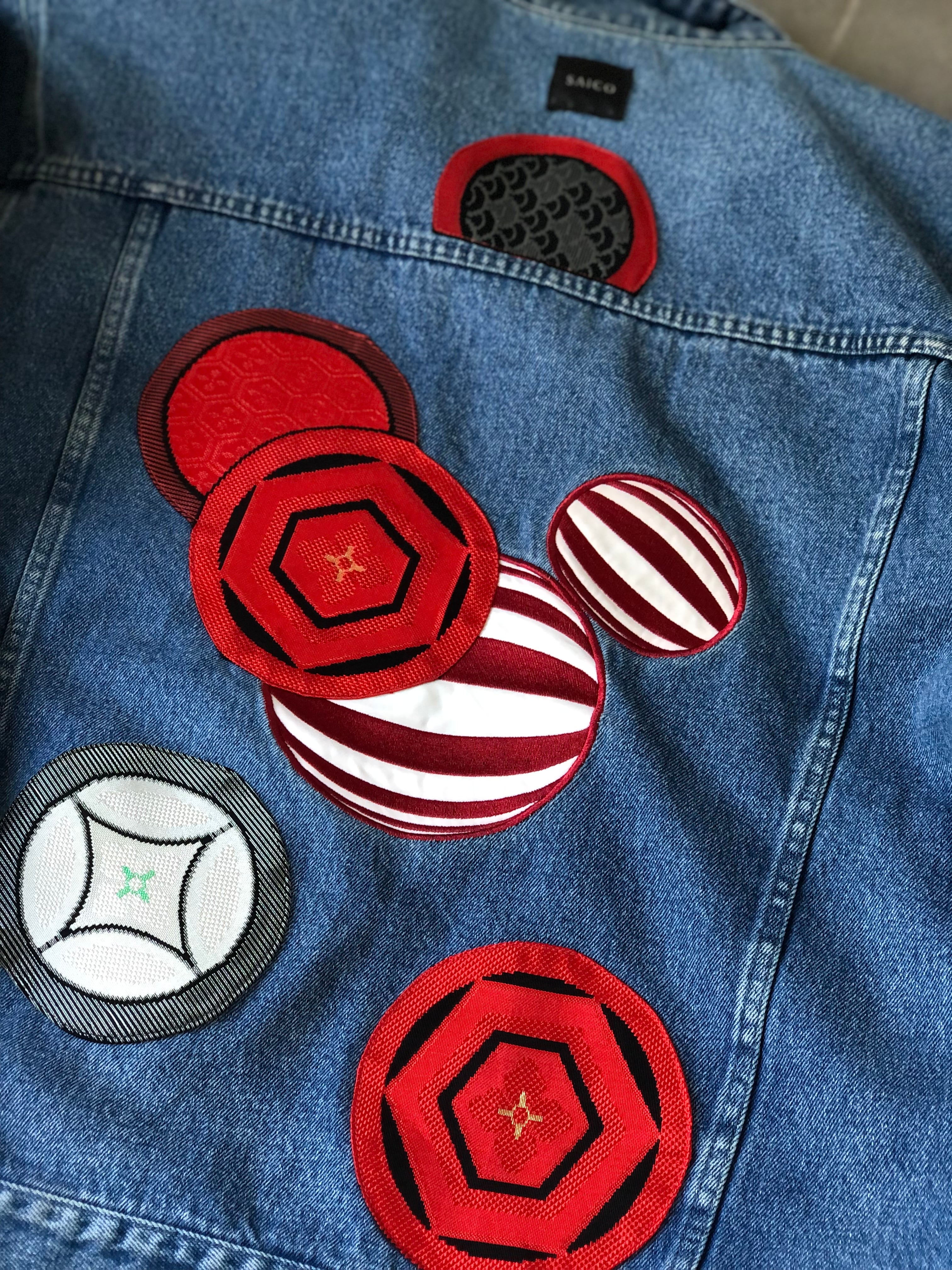 もともとのデニムジャケットに刺繍されていた刺繍をそのまま生かしている作品です