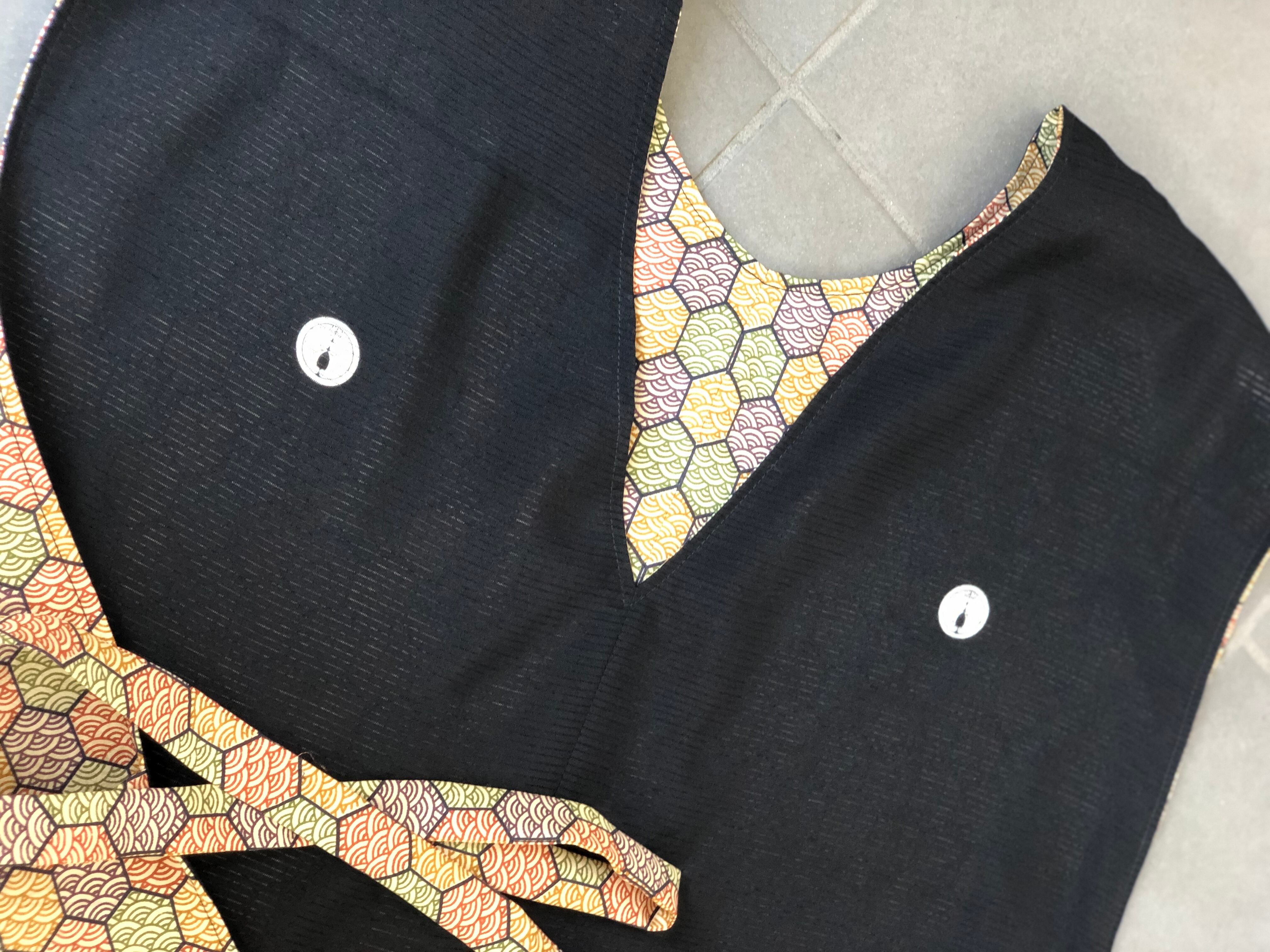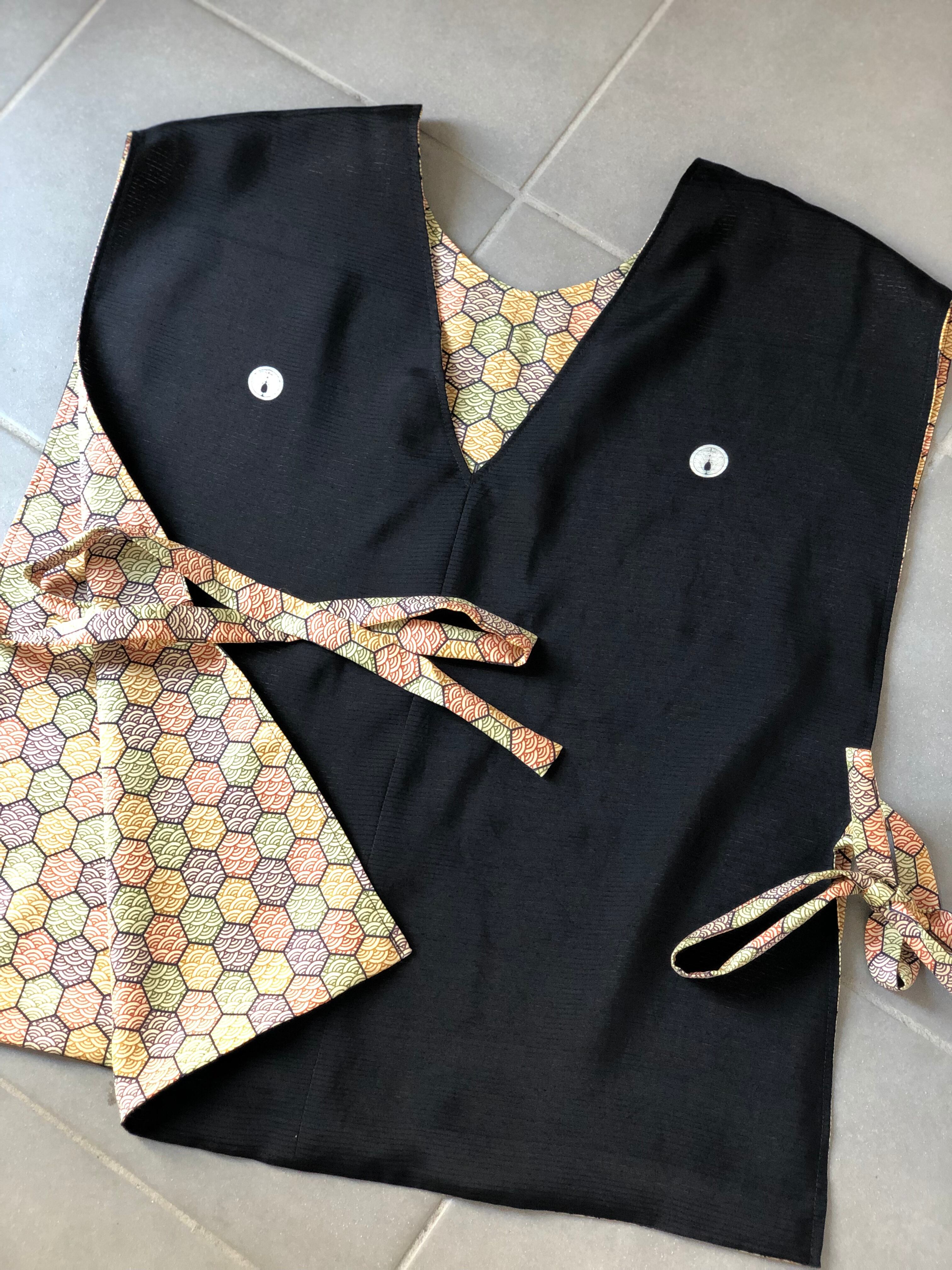 家紋入り絽の黒喪服と亀甲青海波の小紋をリバーシブルにしたジレ