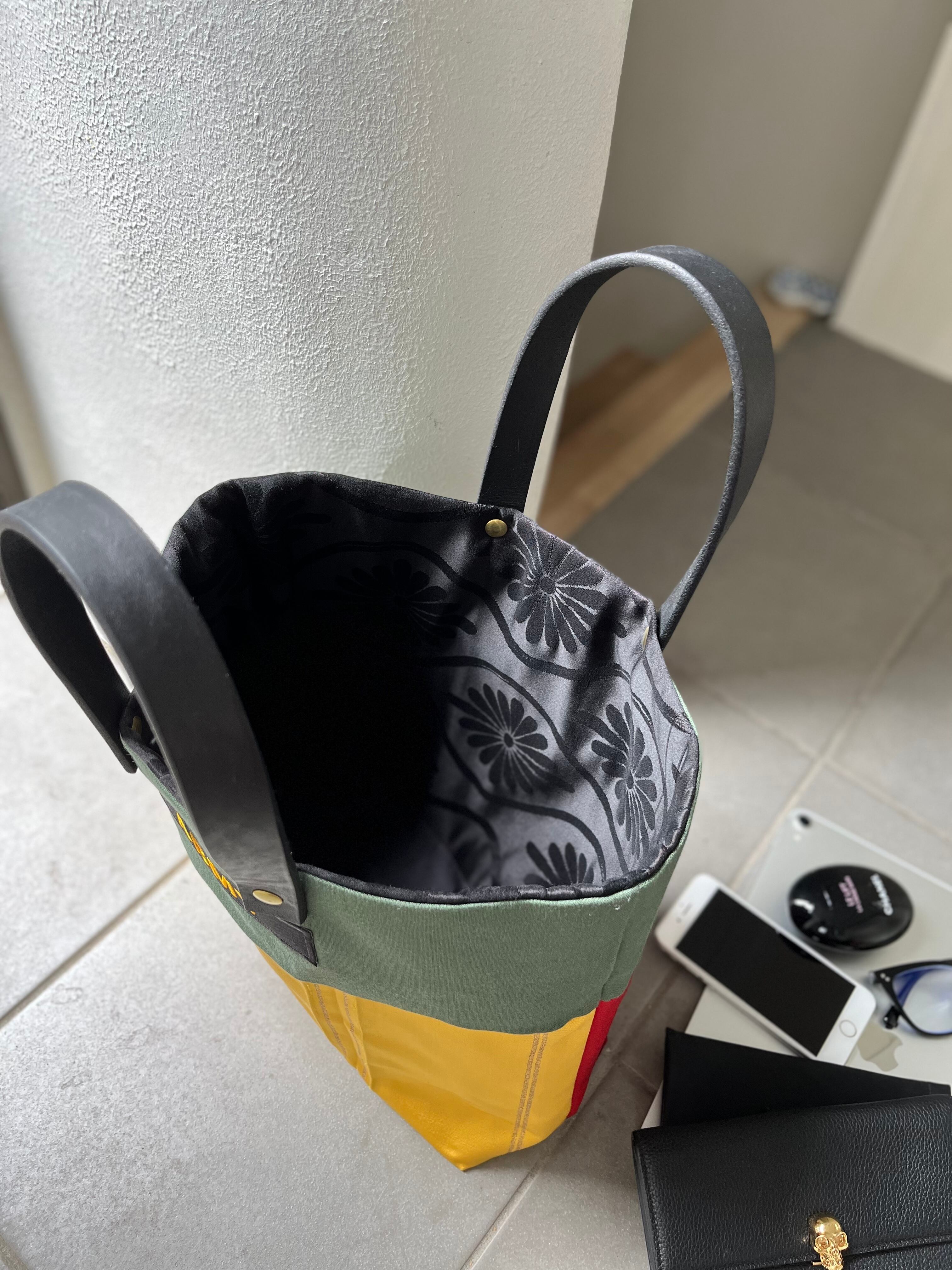 山吹色と朱色、銀の角帯をリユースしたトートバック