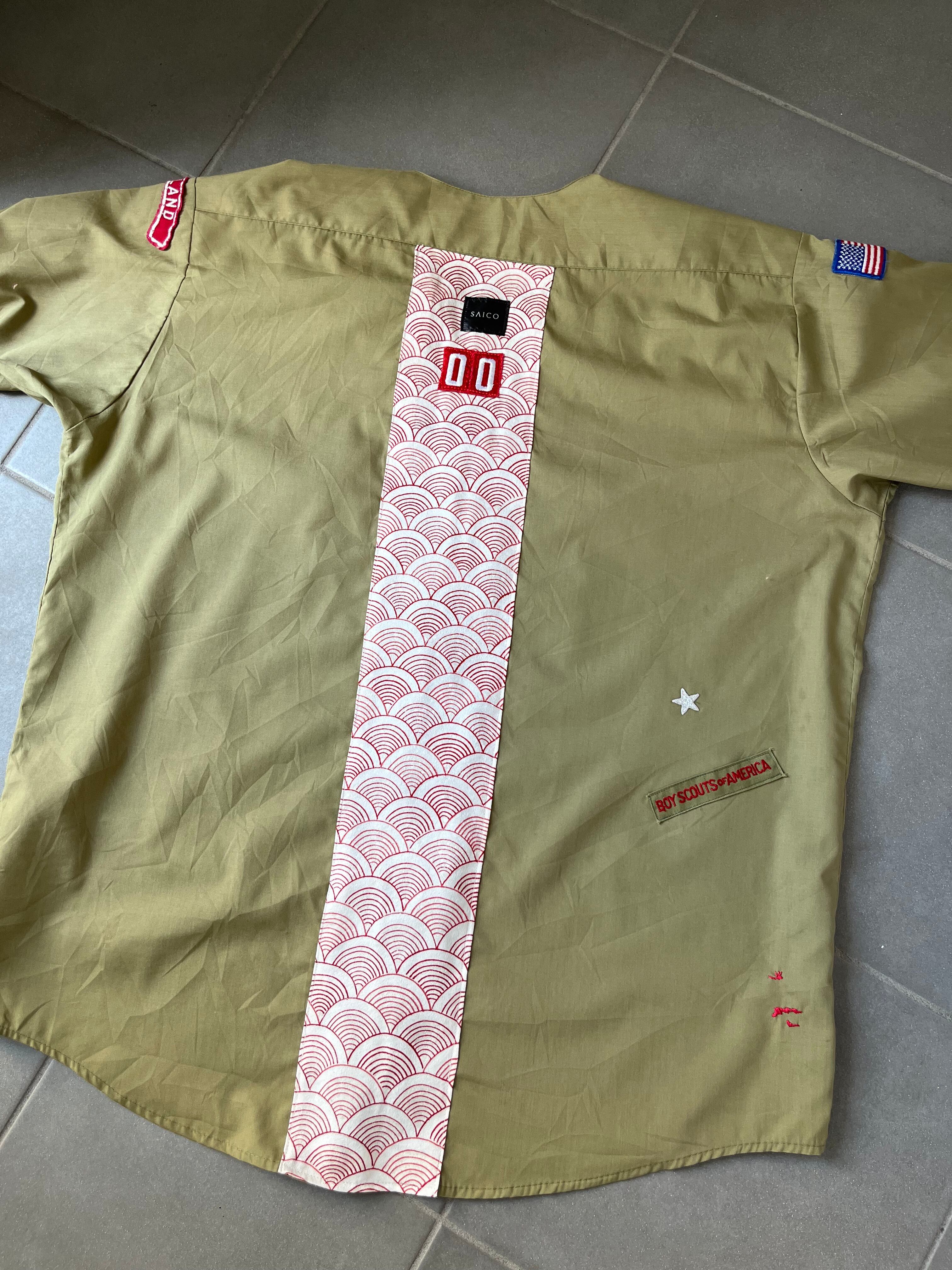 着物リユースパッチワークジャケット 青海波着物小紋×USED USボウイスカウトシャツリボーン