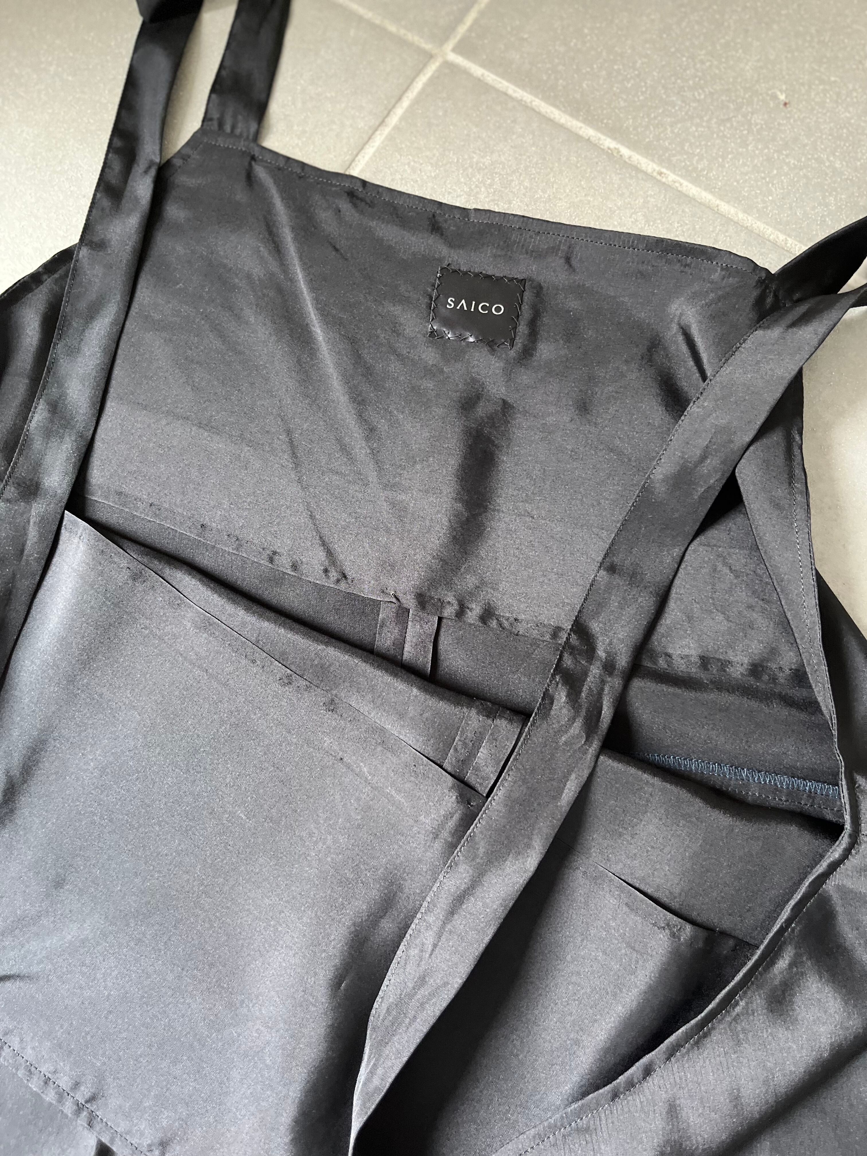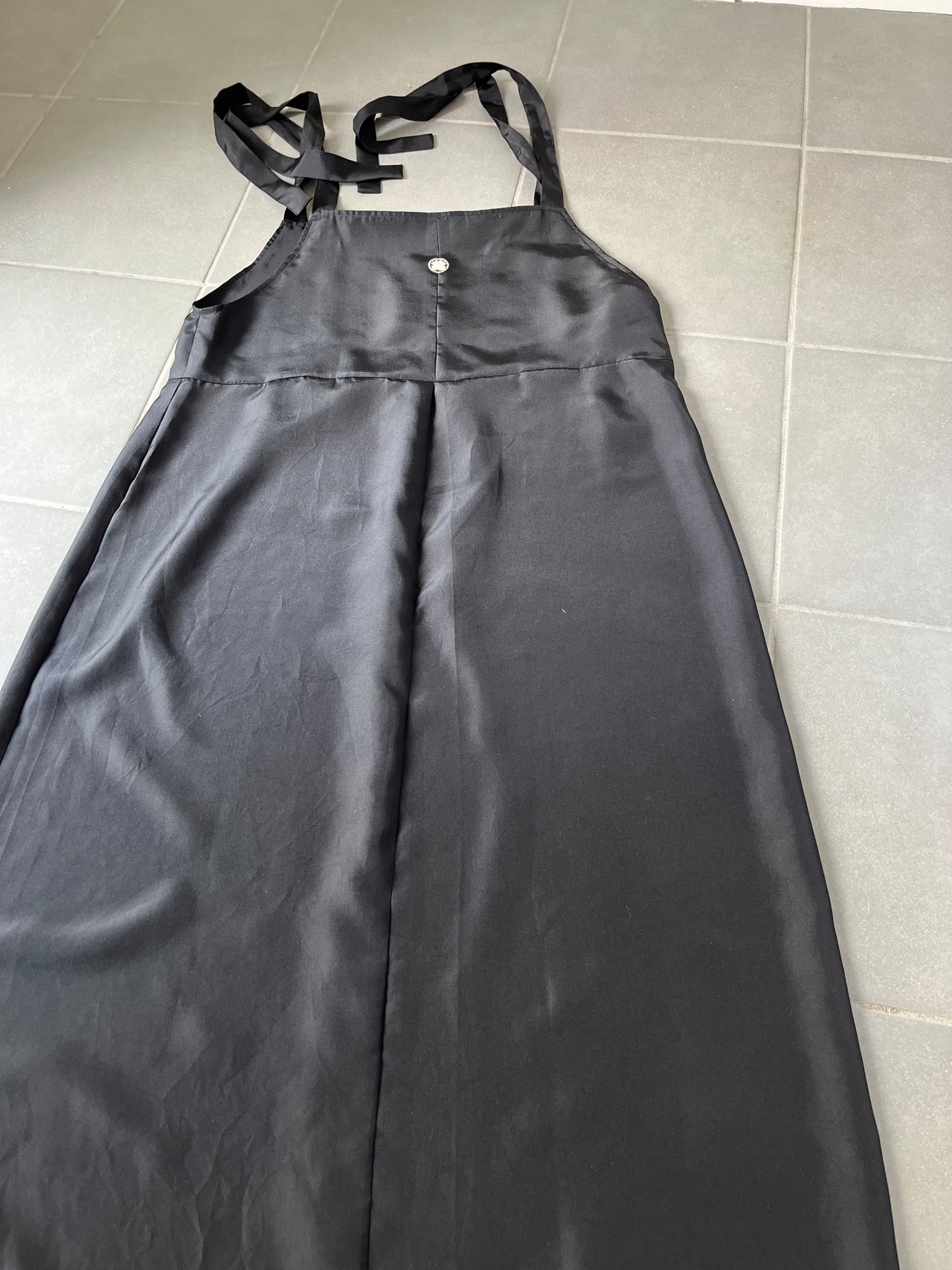 「丸に違い矢」家紋の黒無地 をリユースしたワンピース兼サロペットスカート