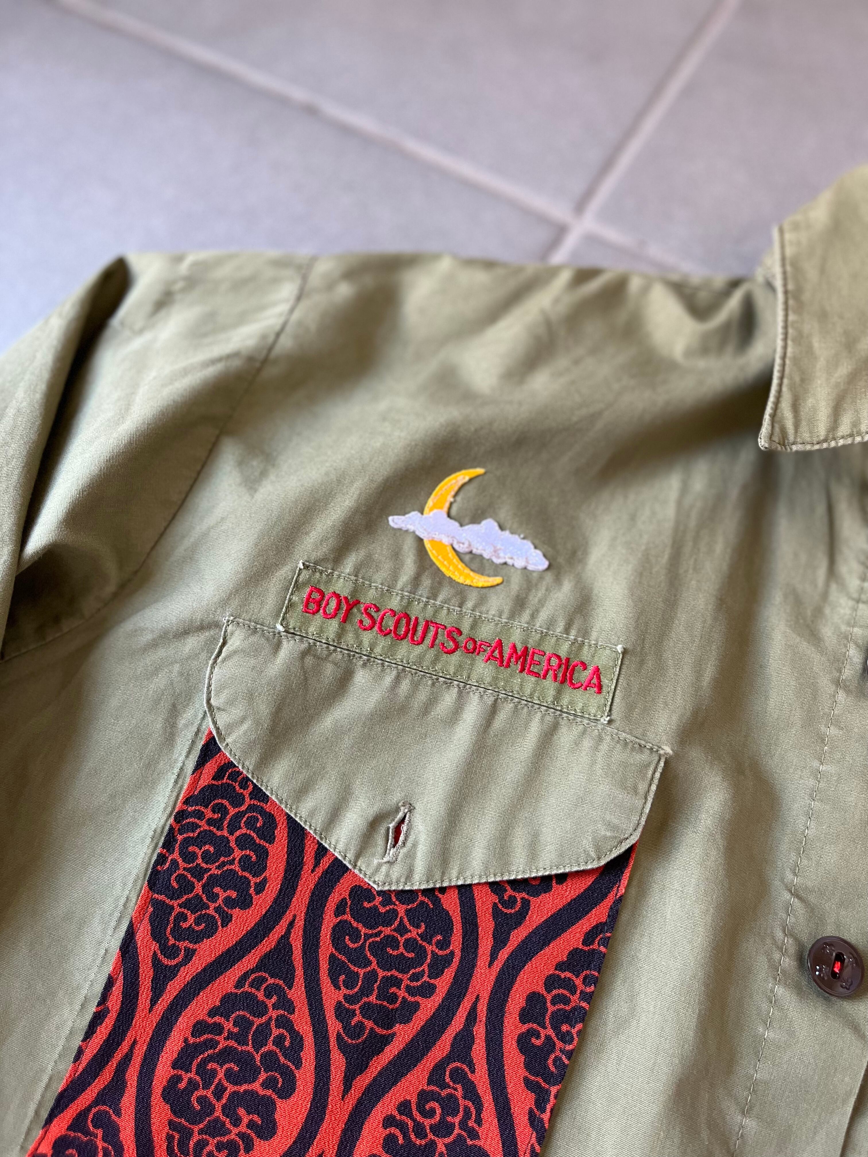 着物リユースパッチワークシャツ 雲取り小紋着物リメイク USED USボウイスカウトシャツリボーン