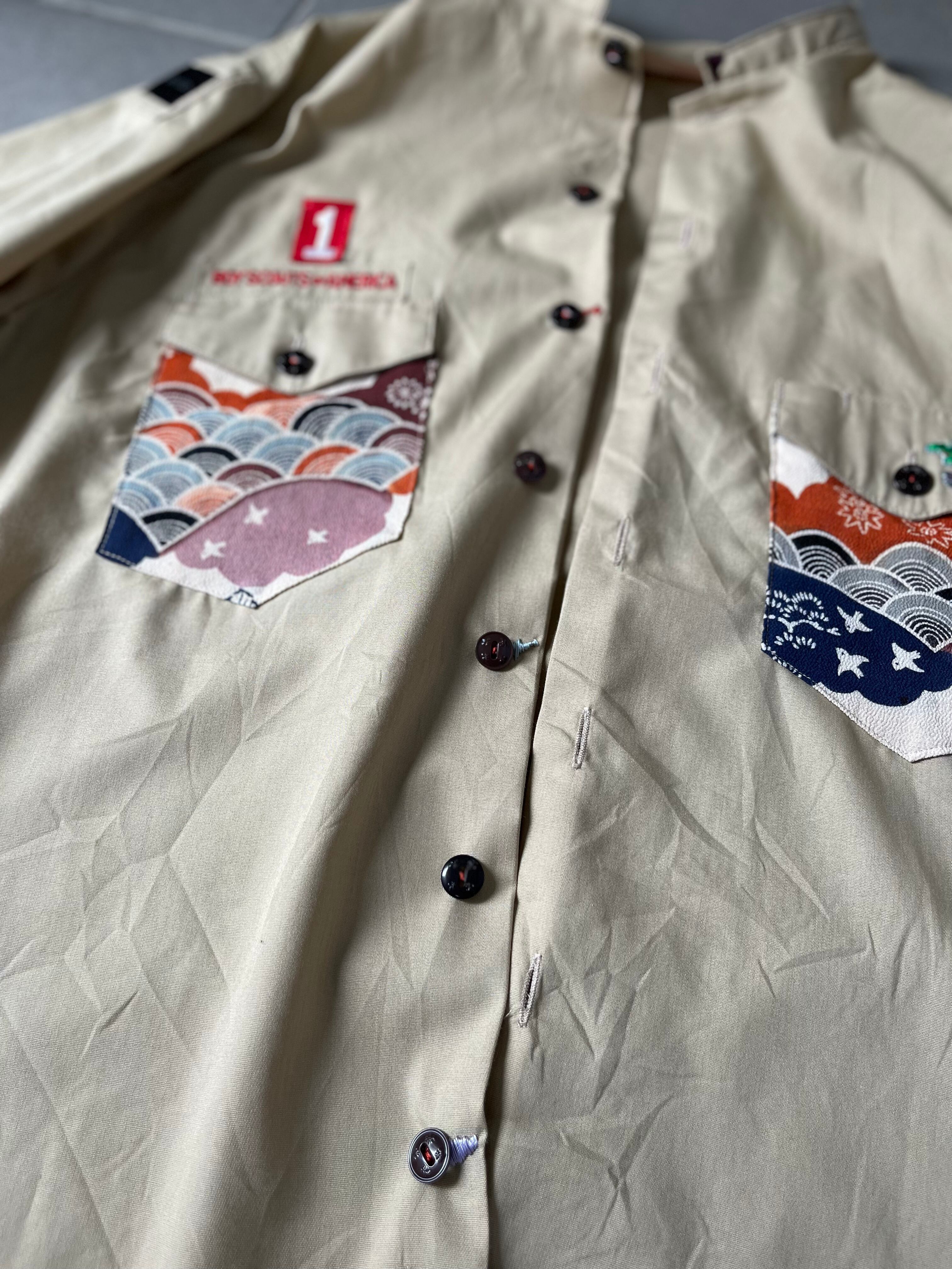チーター様お取り置き 着物リユースパッチワークジャケット 古典柄着物小紋×USED USボウイスカウトシャツリボーン