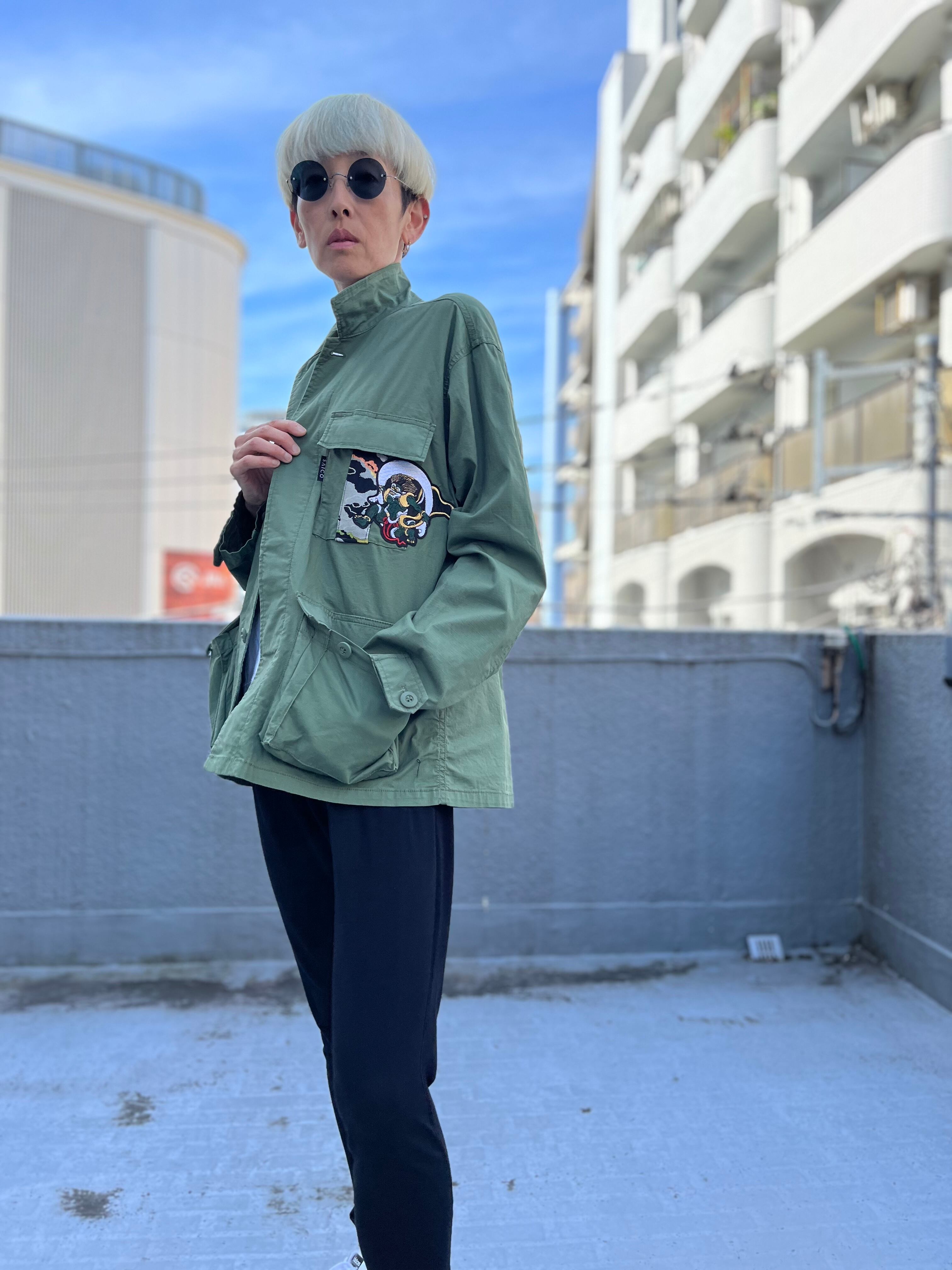 U様専用 風神雷神 迷彩柄帯 パッチワーク ミリタリージャケット M~L 着物リユース 着物リメイク