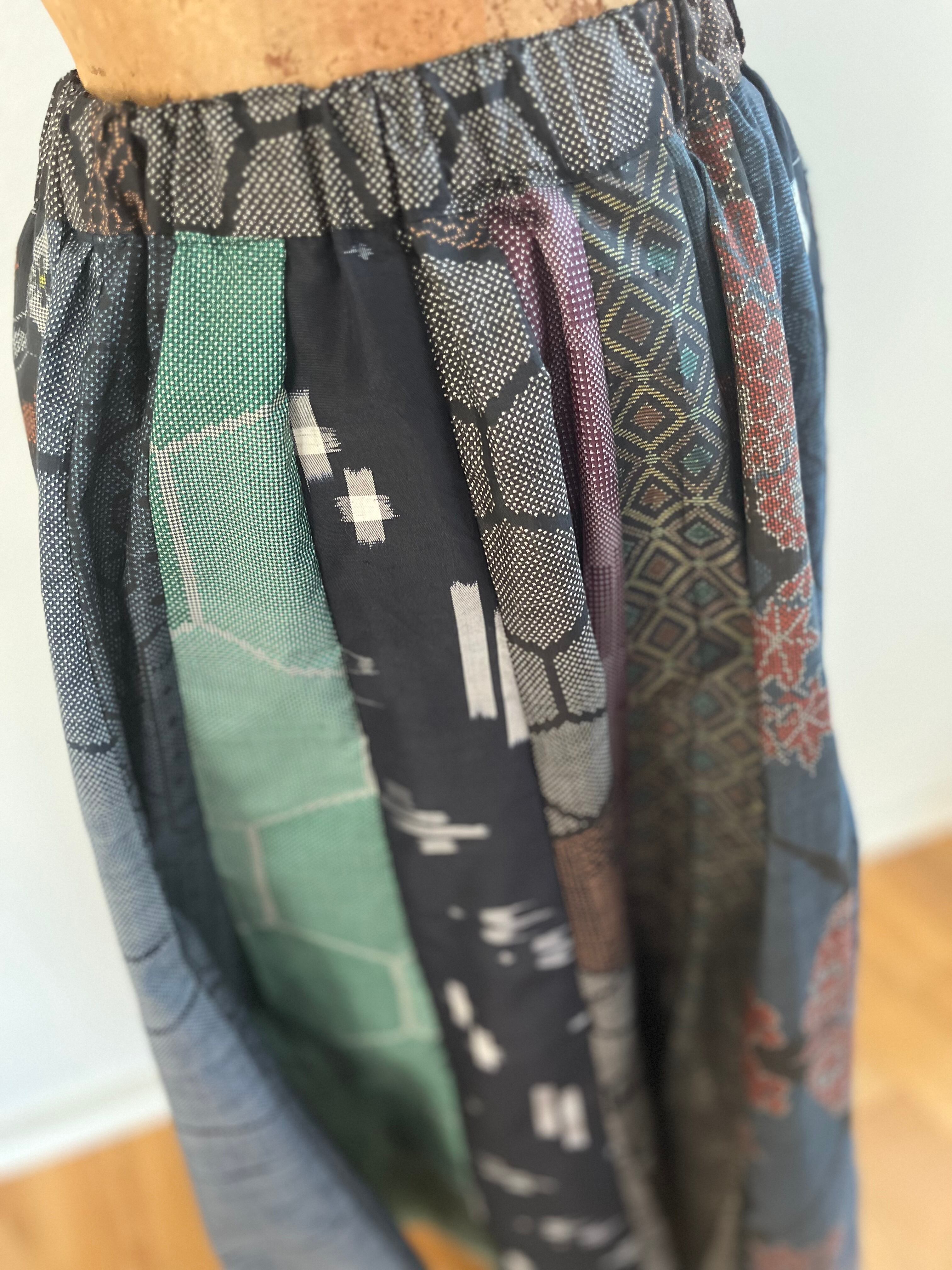 着物リメイク 紬ハギレ 紬寄せ細工ギャザースカート セミオーダー (長さは購入頂いた方のお好みで)