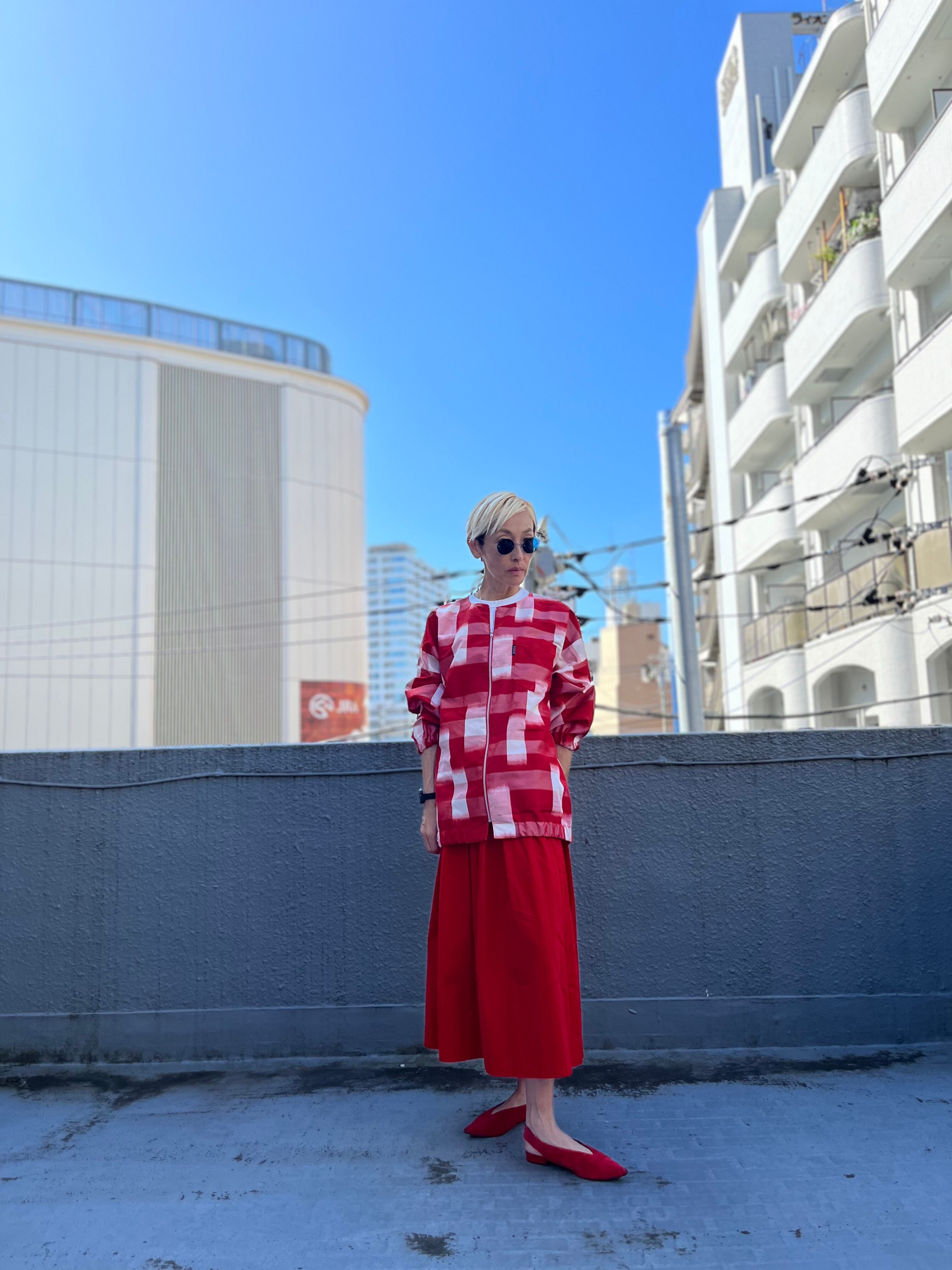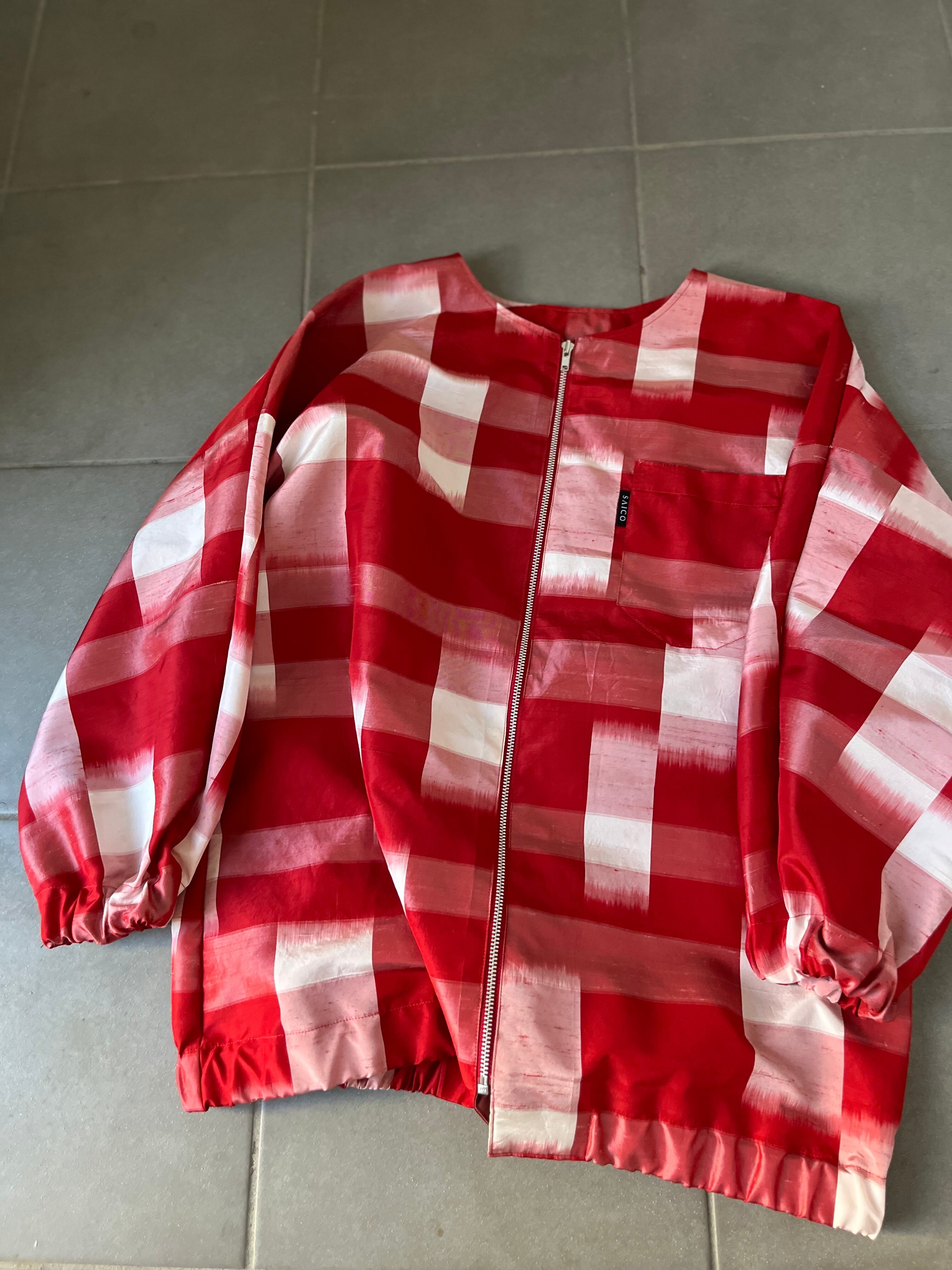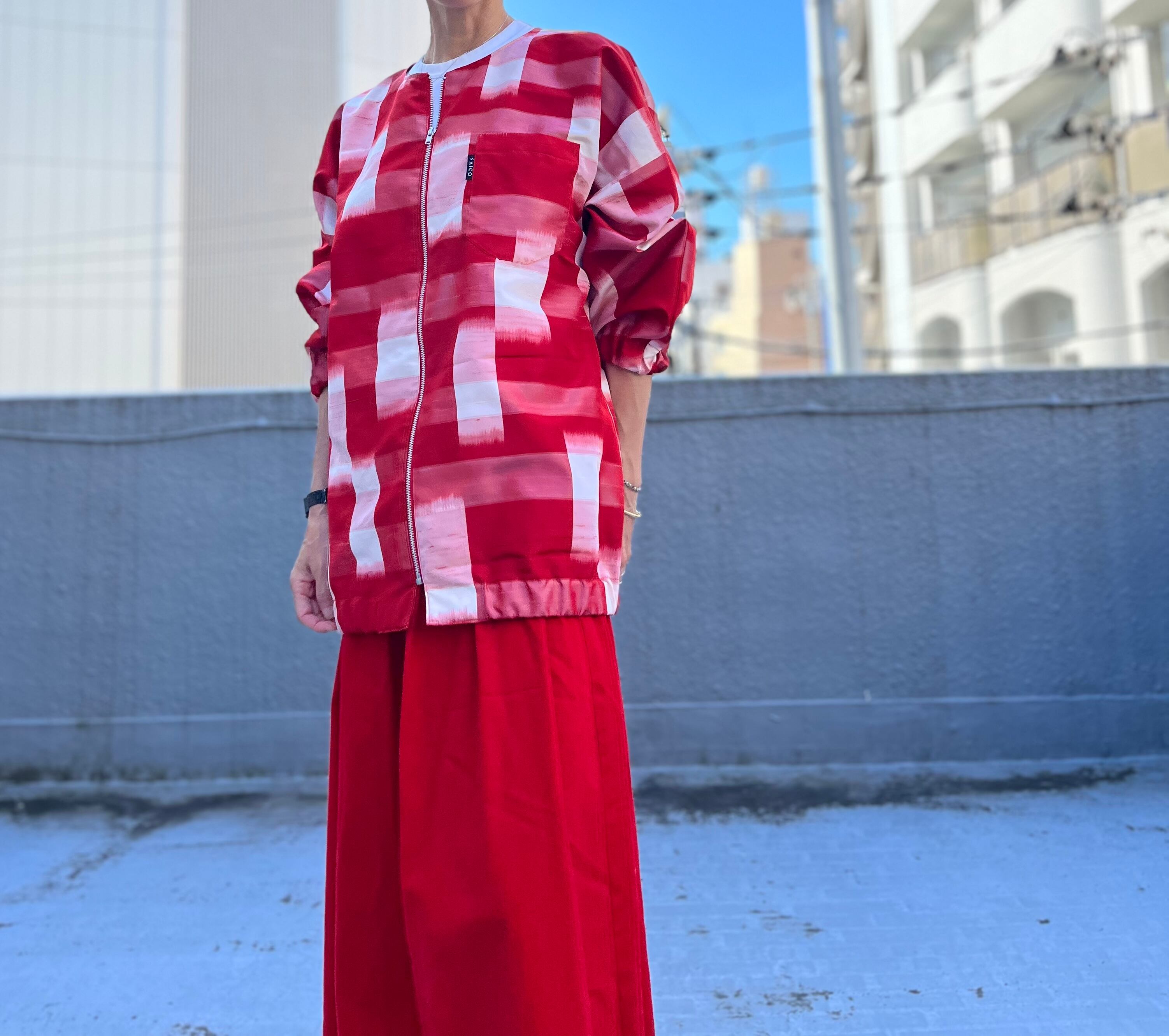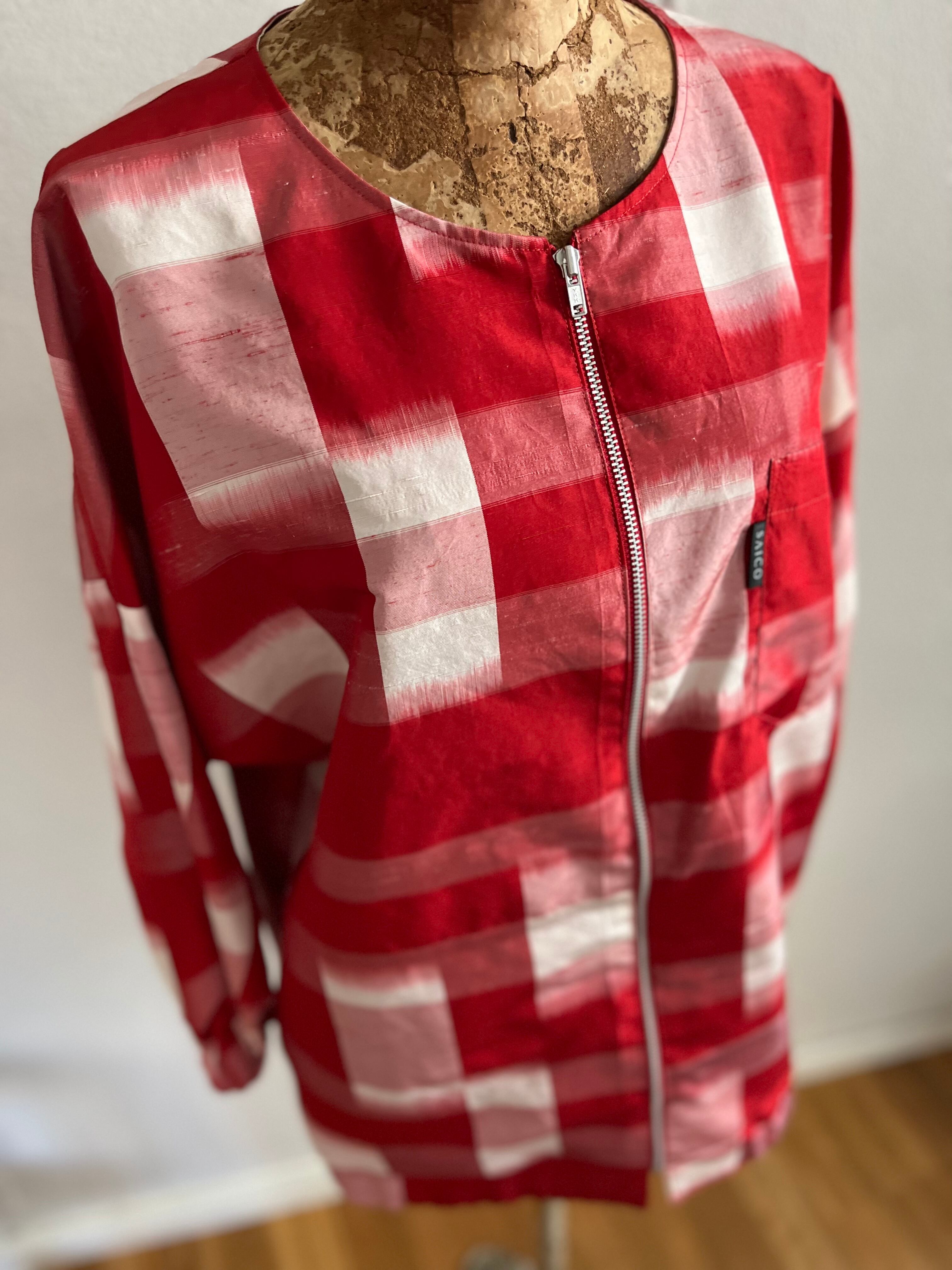紅白紬絣模様 ノーカラーパフスリーブジャケット 着物リメイク